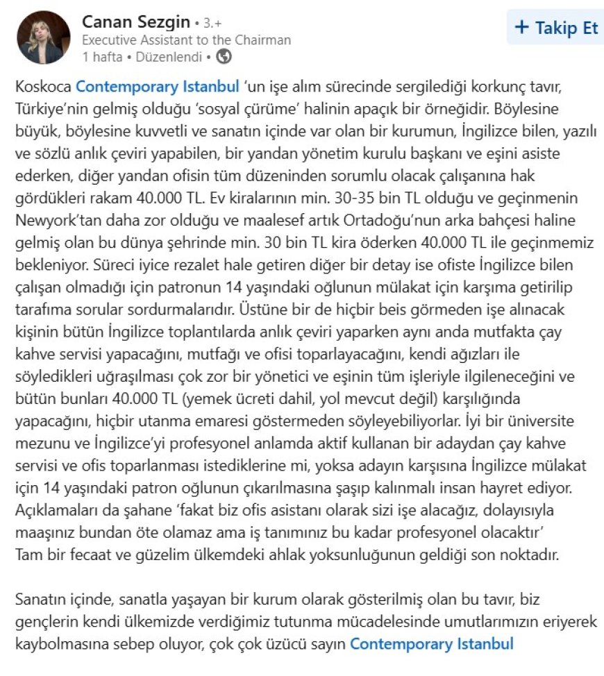 “40 Bin TL’ye Anlık Çeviri ve Ofis Yönetimi”: Contemporary Istanbul Hakkında Ücret ve İş Tanımı İddiası