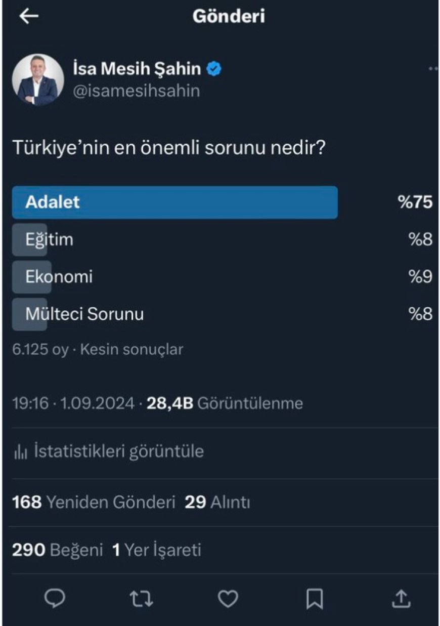 Türkiye'de adalet sistemi üzerine yapılan tartışmalar, son dönemlerde yeniden gündemin merkezine oturdu. Türkiye'nin en önemli sorunları arasında adaletin yer aldığını belirten İsa Mesih Şahin, sosyal medya platformu X üzerinden yaptığı bir anketle bu durumu gözler önüne serdi. Ankete katılan 6.125 kişinin %75’i, Türkiye’nin en büyük sorununun "adalet" olduğunu belirtti. Bu sonuç, toplumun adalet sistemine duyduğu güvenin zayıfladığına ve reform beklentisinin arttığına işaret ediyor.