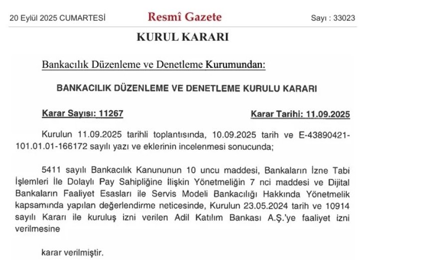 Bankacılık Düzenleme ve Denetleme Kurumu’nun (BDDK) daha önce kuruluş izni verdiği Adil Katılım Bankası A.Ş.’ye faaliyet izni verilmesine ilişkin karar Resmi Gazete’de yayımlandı. Kurulun 23 Mayıs 2024 tarih ve 10914 sayılı kararıyla kuruluş süreci başlatılan banka, “dijital bankaların faaliyet esasları” ile “servis modeli bankacılığı” mevzuatı kapsamında değerlendirildi. Böylece Türkiye’de sadece çevrim içi kanallar üzerinden hizmet vermeyi hedefleyen yeni bir katılım bankası daha resmen sisteme dahil oldu.
