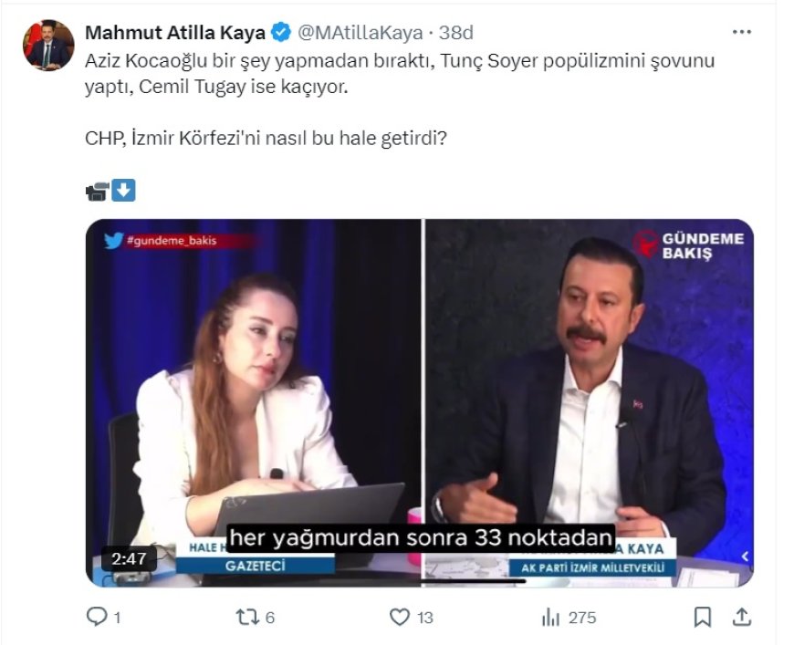 AK Parti İzmir Milletvekili Mahmut Atilla Kaya, sosyal medya üzerinden İzmir Büyükşehir Belediyesi yönetimine yönelik sert eleştirilerde bulundu. Özellikle Aziz Kocaoğlu ve Tunç Soyer'in belediye başkanlıkları döneminde İzmir Körfezi’nin kötüye gittiğini savunan Kaya, son olarak Cemil Tugay’ın yönetim tarzını da hedef aldı. Kaya'ya göre, CHP'li belediye başkanlarının popülist yaklaşımları, İzmir’in çevresel ve altyapısal sorunlarını derinleştirdi, özellikle de Körfez’in temizliği konusunda gereken adımlar atılmadı.