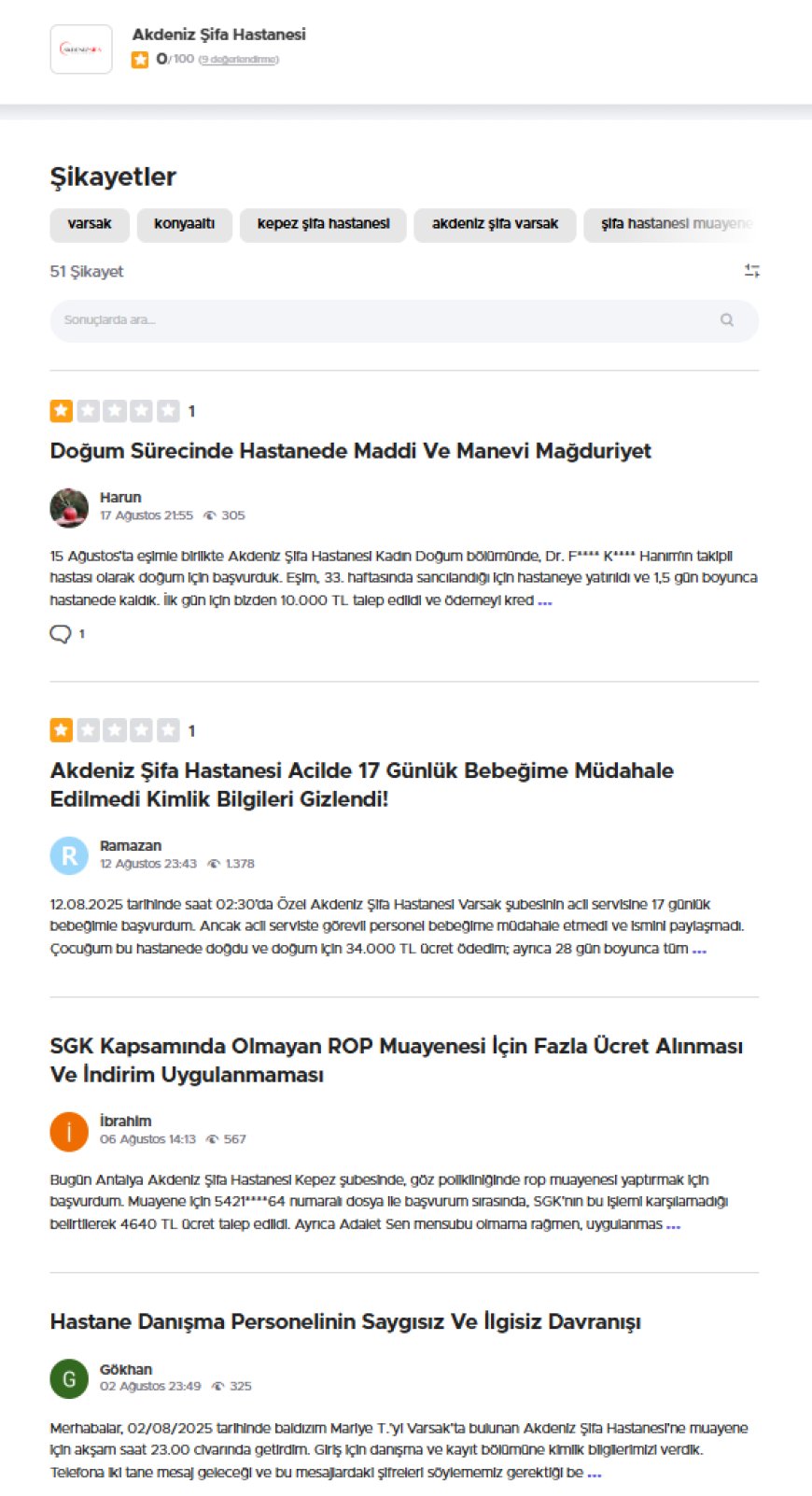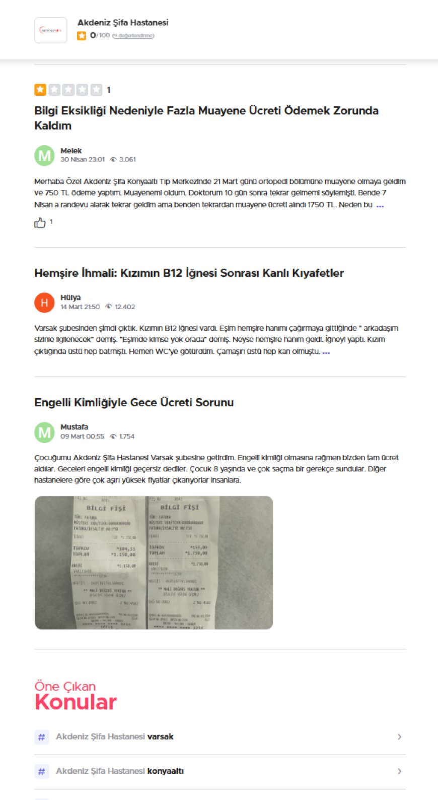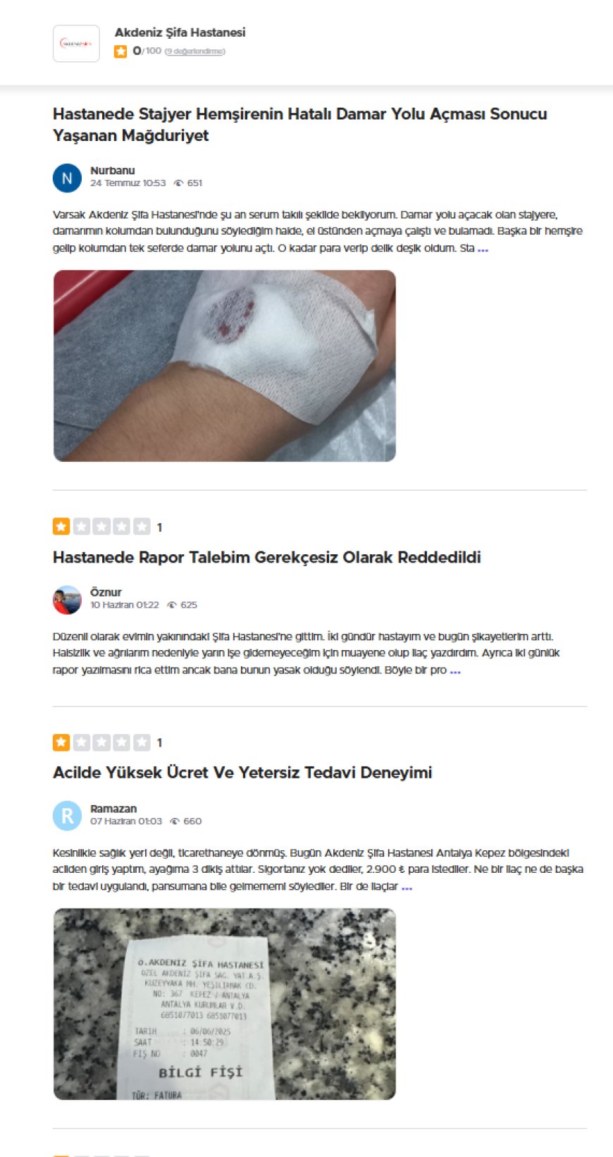 Akdeniz Şifa Hastanesi hakkında Şikayetvar paylaşımlarında ücretlendirme, acil müdahale, stajyer uygulaması ve rapor-muayene süreçleriyle ilgili iddialar öne çıkıyor. Hastalardan şeffaflık ve standartlaşma talep ediliyor.