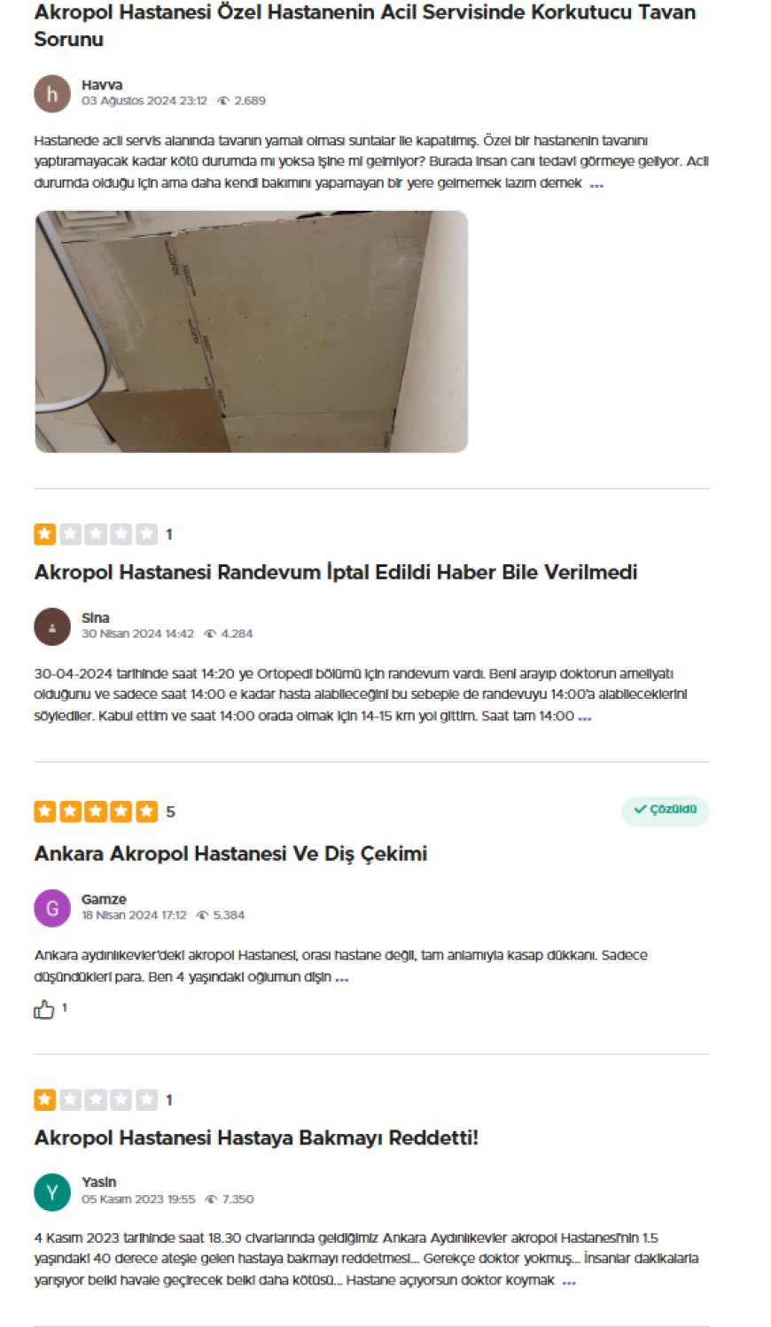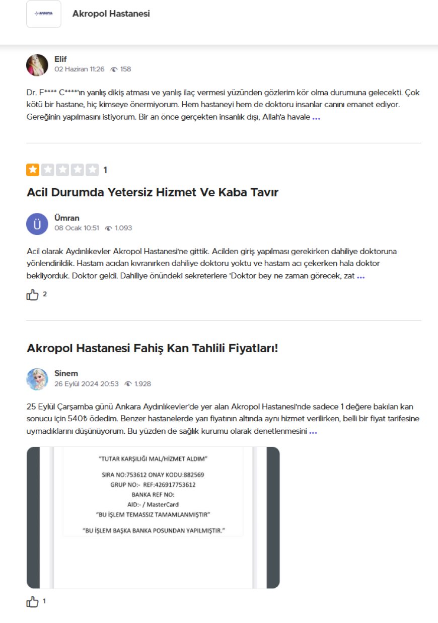 Ankara Aydınlıkevler Akropol Hastanesi'nde yanlış tedavi, yüksek ücret, fiziki yetersizlikler ve hasta güvenliğini tehdit eden ciddi sorunlar Şikayetvar verilerine göre artış gösteriyor.