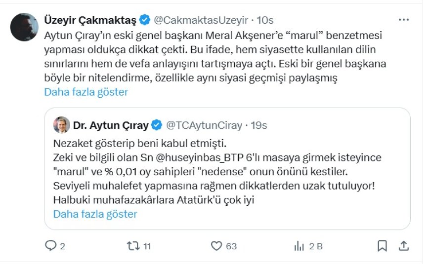 Dr. Aytun Çıray, sosyal medya hesabından yaptığı paylaşımda, 6’lı Masa’da yer almak isteyen BTP Genel Başkanı Hüseyin Baş’a dikkat çekerek, “Marul” ve “%0,01 oy sahipleri” ifadelerini kullanarak, Baş’ın önünün “nedense” kesildiğini ifade etti. Bu açıklamalar, hem Hüseyin Baş’ın liderliği hem de Meral Akşener’in bu süreçteki rolü üzerine yeni tartışmalara kapı araladı.