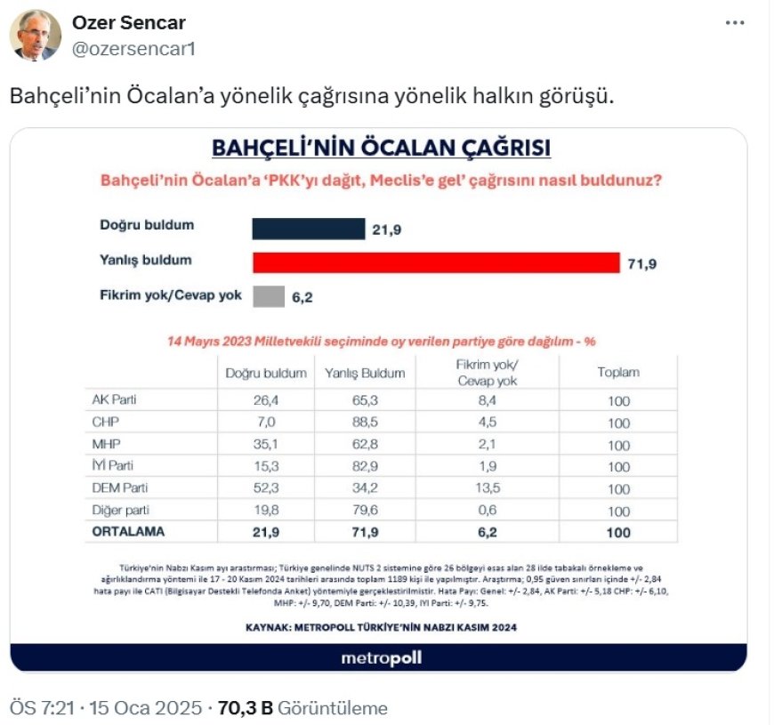 MHP Seçmeni Bahçeli’nin Açıklamasını Desteklemiyor MetroPOLL Araştırma’nın Kurucusu Özer Sencar, MHP Genel Başkanı Devlet Bahçeli’nin Abdullah Öcalan’a yönelik çağrısına ilişkin dikkat çekici anket sonuçlarını kamuoyuyla paylaştı. Verilere göre, çağrıya destek sınırlı kalırken, en büyük desteğin DEM Parti seçmeninden geldiği görüldü.