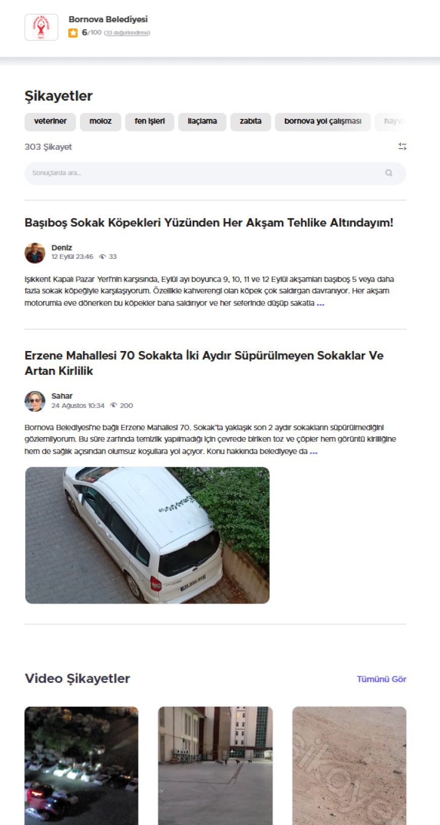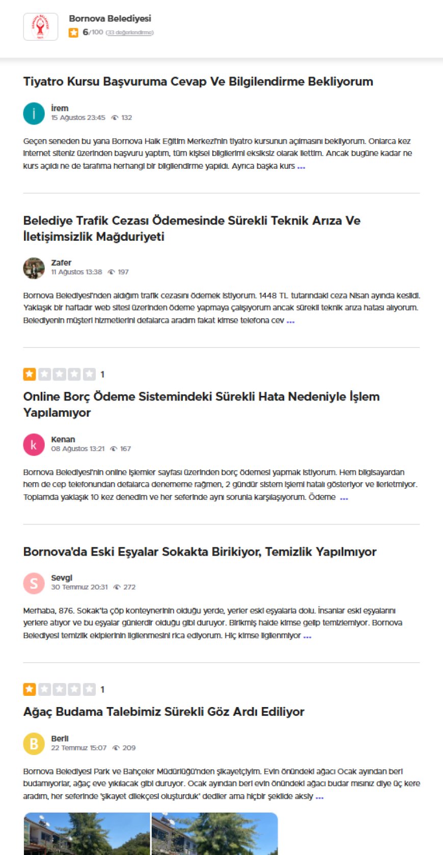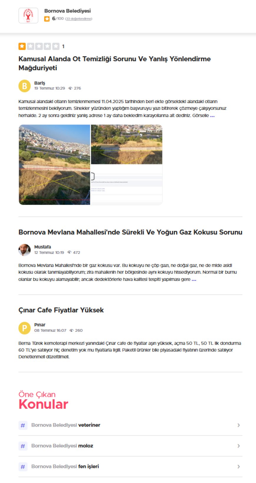 Habere referans olarak Şikayetvar sitesinde yer alan şikâyetlere göre; Bornova Belediyesi’ne son aylarda iletilen başvurular ağırlıkla sokak hayvanları güvenliği, sokak ve konteyner çevresi temizliği, çevrimiçi ödeme–başvuru sistemleri, budama ve ot temizliği ile tesis fiyat şeffaflığı başlıklarında yoğunlaşıyor. Vatandaşlar, mahalle bazında düzenli denetim ve hızlı geri dönüş talep ediyor. Haber yayına hazırlanırken belediyeden konuya ilişkin resmî bir açıklama alınamadı.