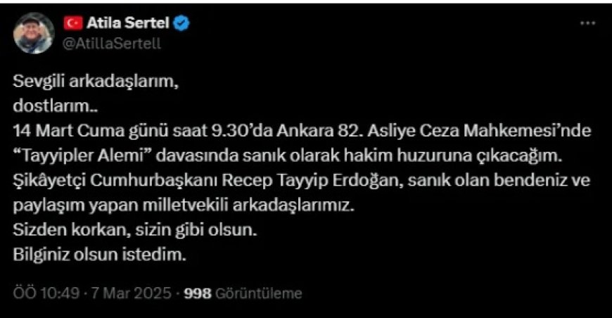CHP’li eski milletvekili Atila Sertel, sosyal medyada yaptığı bir paylaşım nedeniyle yargılanıyor. Sertel, dönemin CHP Genel Başkanı Kemal Kılıçdaroğlu’nun paylaştığı bir tweeti retweet ettiği için ‘Tayyipler Alemi’ davasında sanık olarak 14 Mart Cuma günü Ankara 82. Asliye Ceza Mahkemesi’nde hakim karşısına çıkacağını duyurdu.