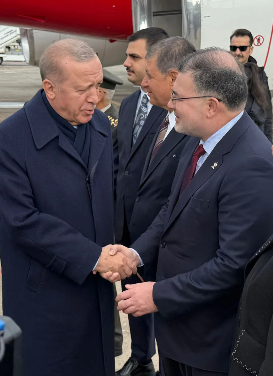 İZMİR / TÜRKİYE — Cumhurbaşkanı ve AK Parti Genel Başkanı Recep Tayyip Erdoğan, Aydın’da düzenlenecek toplu açılış törenine katılmak üzere geldiği İzmir’de, aralarında Büyükşehir Belediye Başkanı Cemil Tugay’ın da bulunduğu bir heyet tarafından karşılandı.