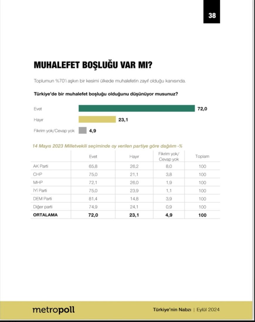 Ankete katılan AKP seçmenlerinin yüzde 65,8’i, muhalefet boşluğu olduğunu düşünürken, CHP ve İYİ Parti seçmenlerinde bu oran yüzde 75’e ulaştı. MHP’lilerin yüzde 72’si ve DEVA Partililerin yüzde 81,4’ü de ülkede muhalefet eksikliği olduğunu belirtti.