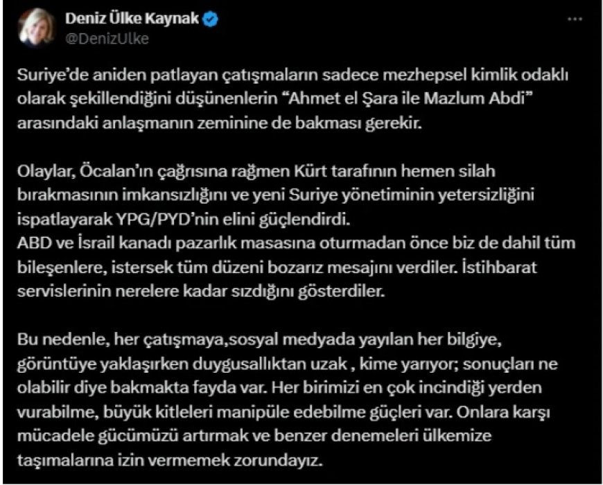 Dünya gazetesi yazarı Prof. Dr. Deniz Ülke Kaynak, sosyal medya hesabından yaptığı paylaşımda, Suriye’de aniden patlak veren çatışmaların mezhepsel kimlik odaklı olmadığını ve küresel güçlerin müdahalesinin süreci belirlediğini vurguladı.