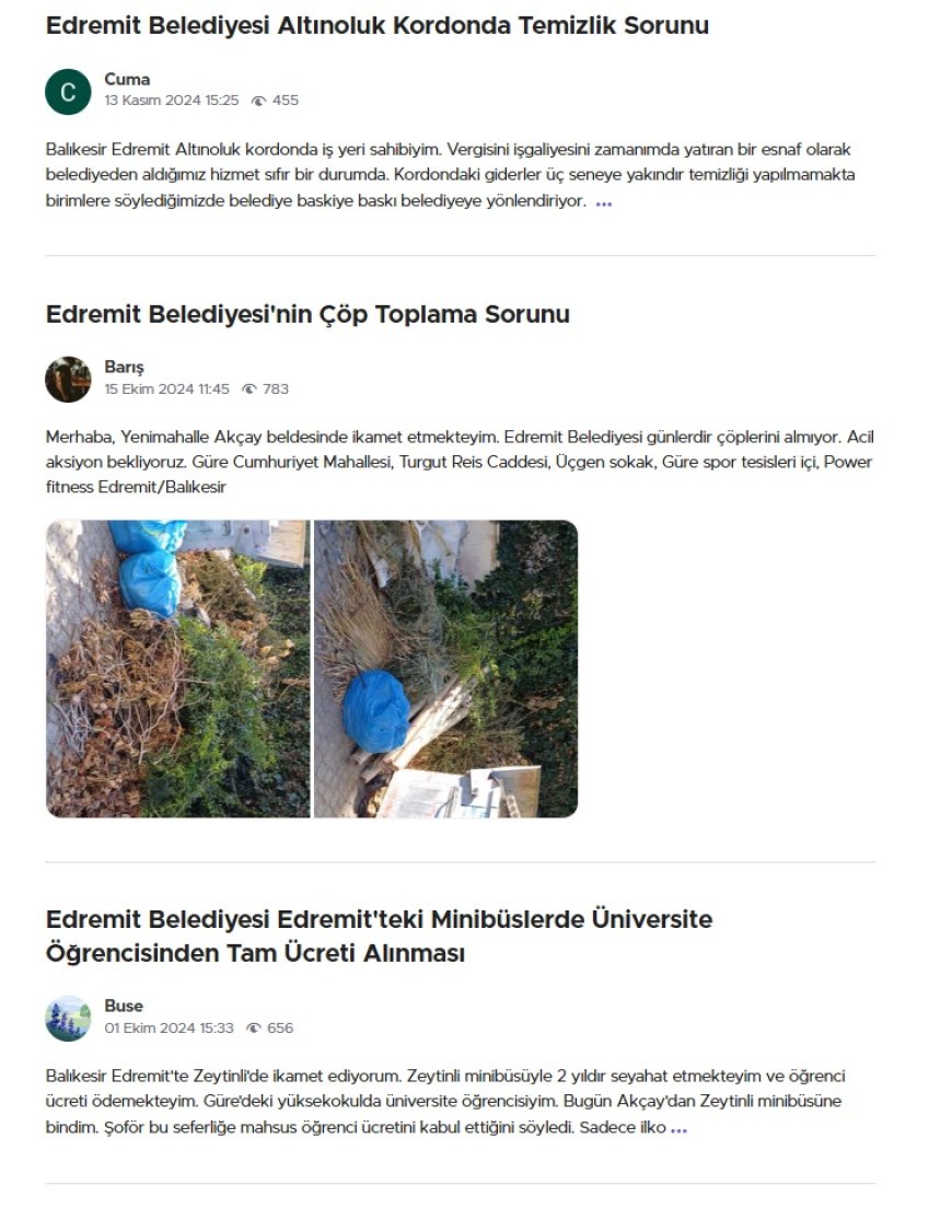 Edremit'in birçok mahallesinde çöp toplama hizmetlerinin aksadığı, yolların tozdan geçilmediği, sokakların süpürülmediği ve su kesintileriyle ilgili yeterli bilgilendirme yapılmadığı yönünde çok sayıda şikayet bulunuyor. Özellikle Altınoluk, Akçay ve Çamlıbel mahallelerinde bu sorunlar vatandaşın günlük yaşamını doğrudan etkiliyor.