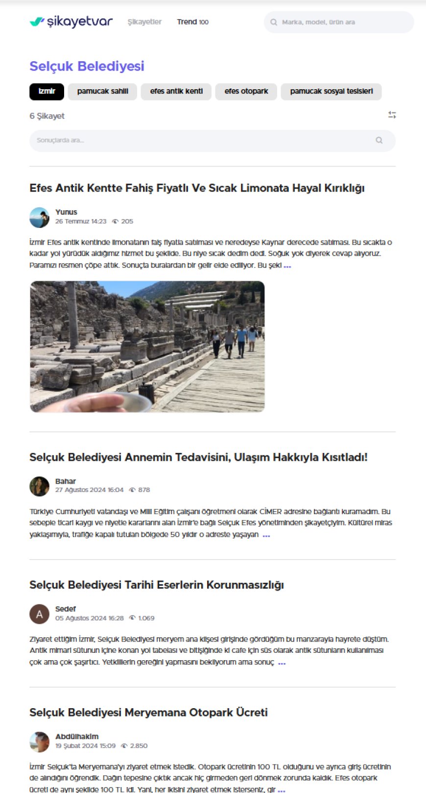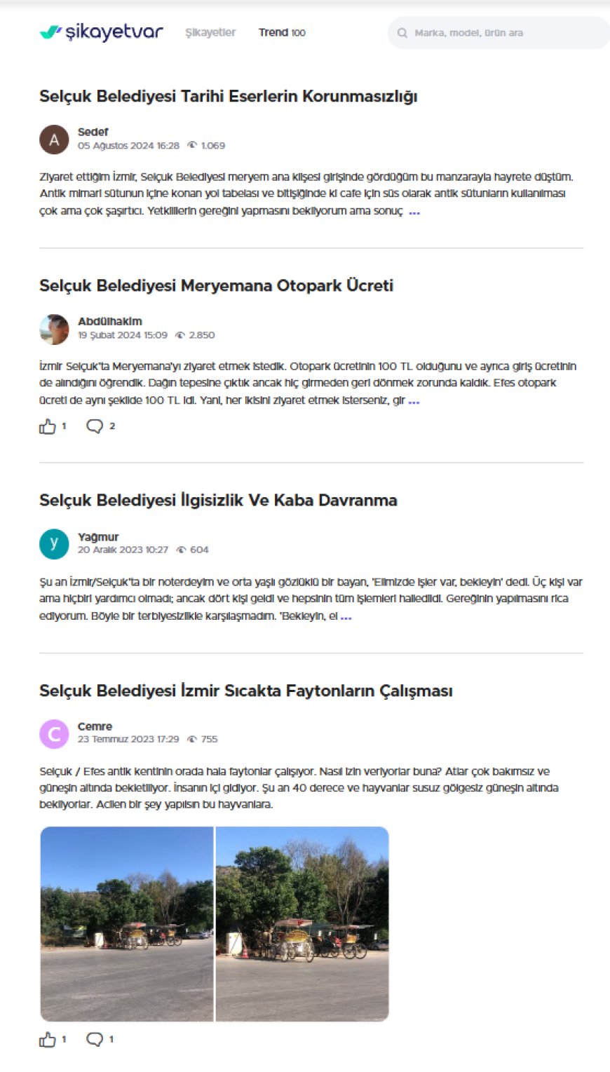 Selçuk’ta Şikayetvar’a yansıyan paylaşımlar; Efes ve Meryem Ana çevresinde fiyat ve otopark politikaları, hizmet kalitesi, kültür mirası hassasiyeti, faytonlarda hayvan refahı ve yerel erişim konularında çözüm ve şeffaflık çağrısı yapıyor.