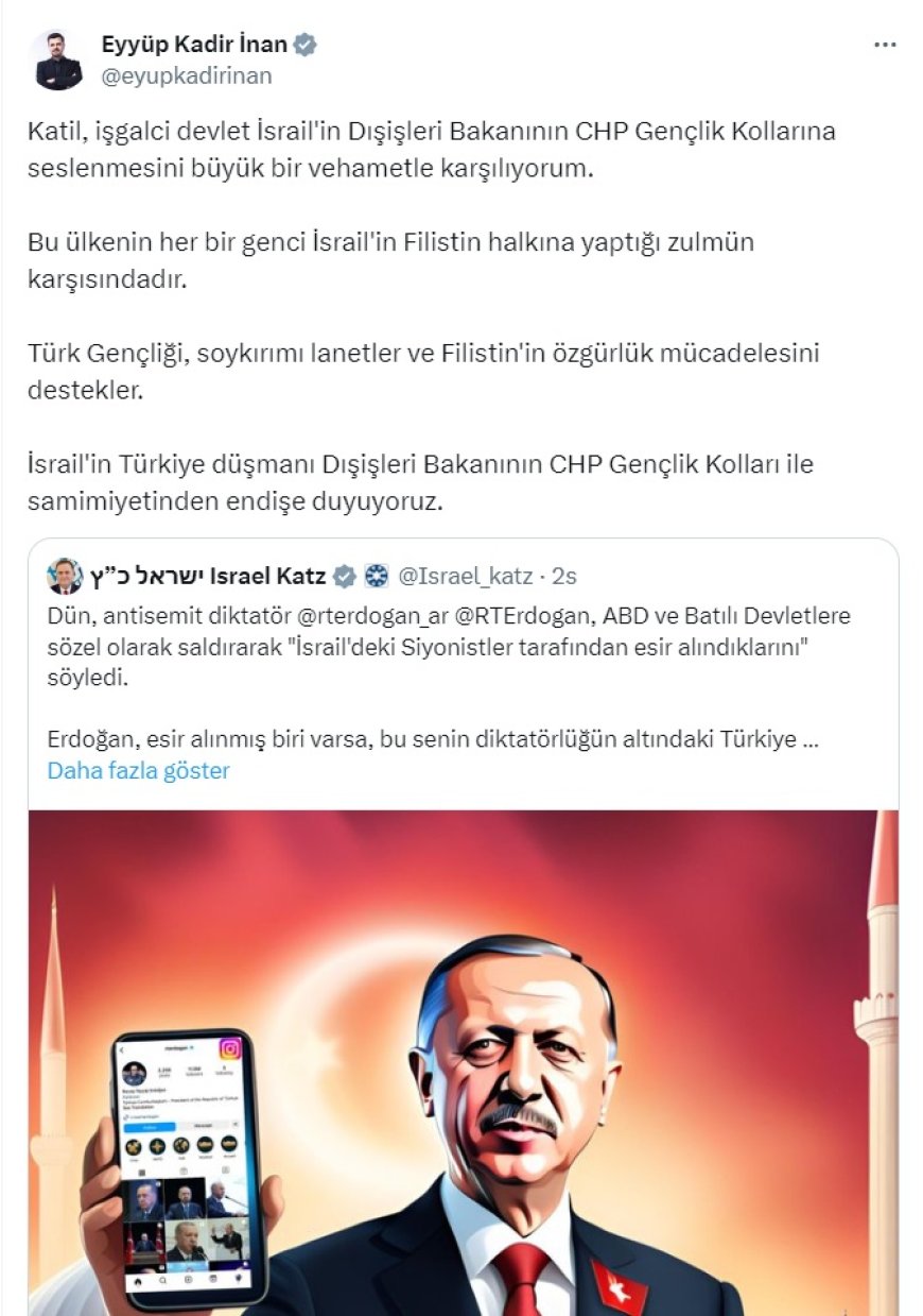 AK Parti İzmir Milletvekili ve AK Parti Gençlik Kolları Başkanı Eyyüp Kadir İnan, Katz'ın açıklamalarına sosyal medya üzerinden yanıt verdi. İnan, "Katil, işgalci devlet İsrail'in Dışişleri Bakanının CHP Gençlik Kollarına seslenmesini büyük bir vehametle karşılıyorum. Bu ülkenin her bir genci İsrail'in Filistin halkına yaptığı zulmün karşısındadır. Türk Gençliği, soykırımı lanetler ve Filistin'in özgürlük mücadelesini destekler. İsrail'in Türkiye düşmanı Dışişleri Bakanının CHP Gençlik Kolları ile samimiyetinden endişe duyuyoruz" ifadelerini kullandı.