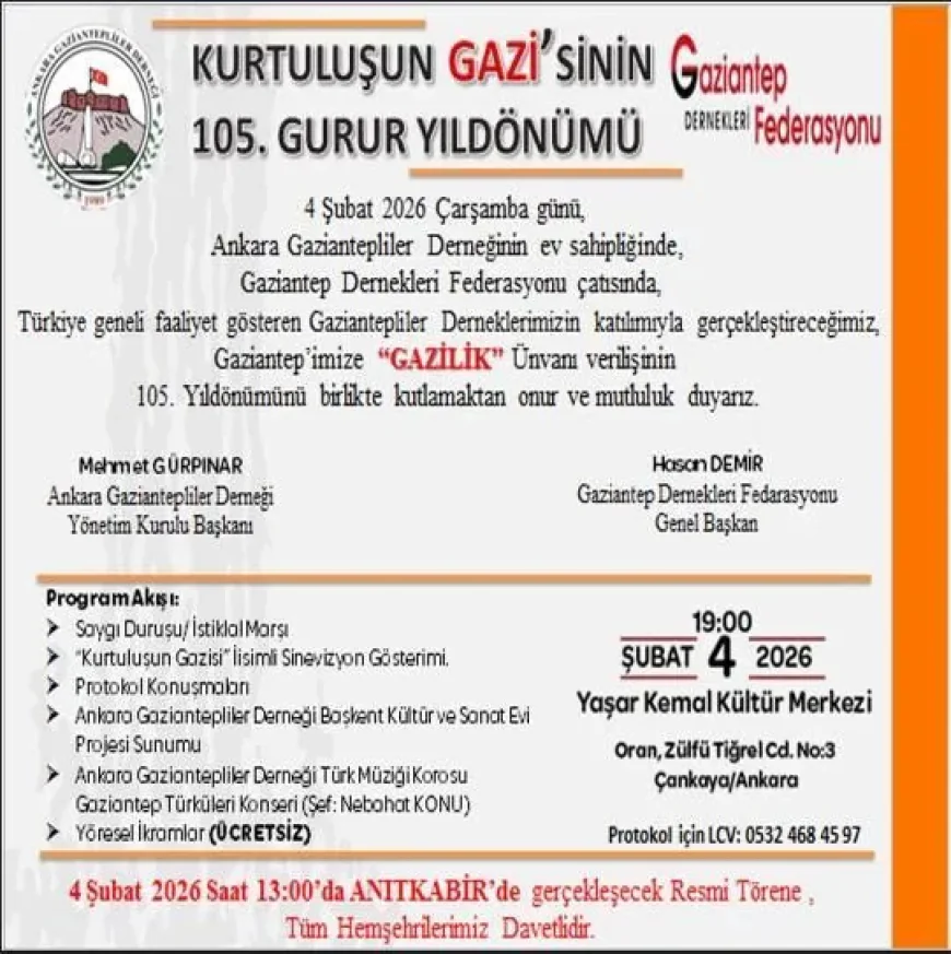 ANKARA, TÜRKİYE — Ankara Gaziantepliler Derneği, 4 Şubat 2026 Çarşamba günü Gaziantep’e “Gazi” unvanı verilişinin 105. yıl dönümü dolayısıyla başkentte bir dizi resmi tören ve kapsamlı bir kutlama programı düzenleyecek.