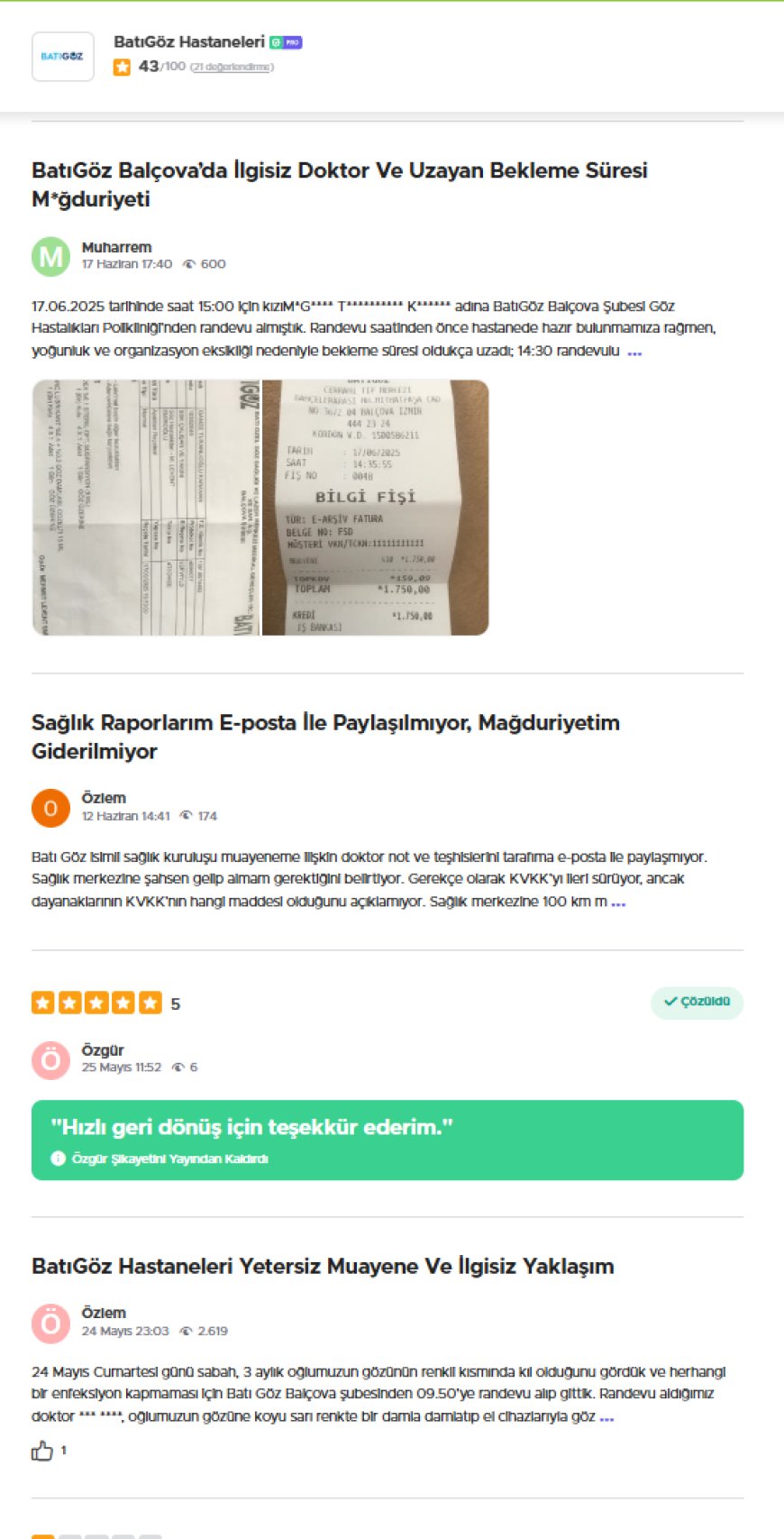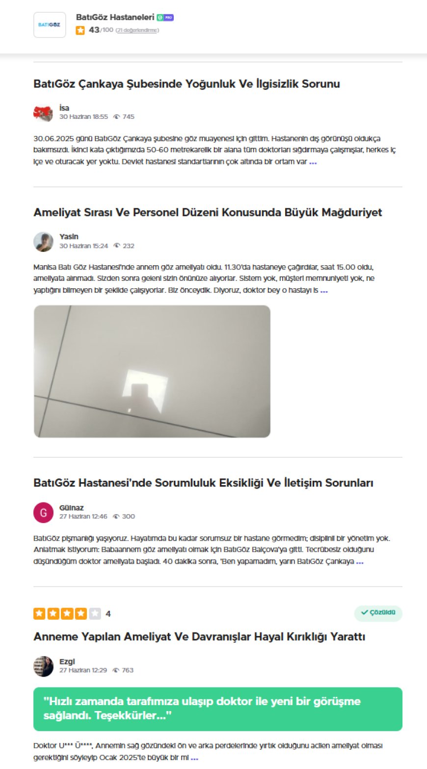 Bazı şikayetler çözüldü olarak işaretlense de, BatıGöz Hastaneleri’nin hasta memnuniyetini sürdürülebilir düzeyde sağlayabildiğine dair genel bir kanaat oluşmadığı görülüyor. Hizmetin kalitesini iyileştirmek için daha sistemli ve hasta odaklı bir yaklaşım geliştirilmesi gerektiği vurgulanıyor.