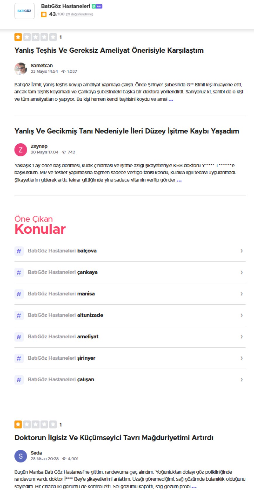 İzmir merkezli özel sağlık kuruluşu BatıGöz Hastaneleri, Şikayetvar platformuna yansıyan hasta yorumlarına göre ciddi bir hasta memnuniyetsizliğiyle karşı karşıya. İzmir, Manisa ve İstanbul gibi farklı illerdeki şubelerde yaşanan benzer sorunlar, kurumsal yapının hasta deneyimi yönetiminde zafiyet yaşadığını ortaya koyuyor.