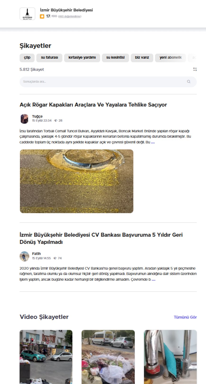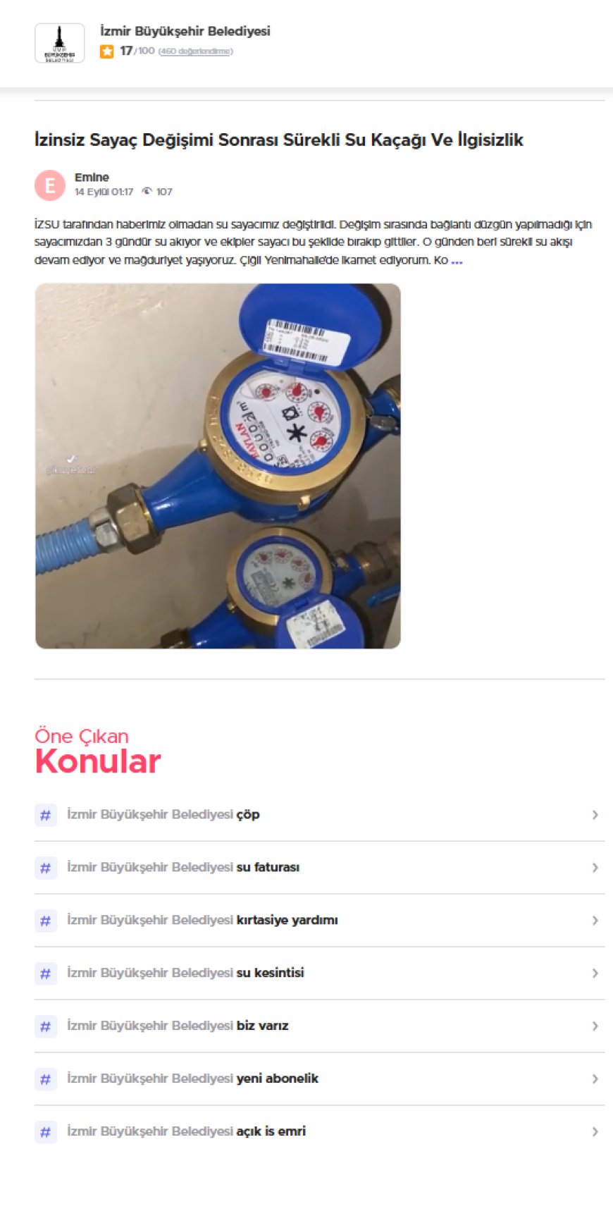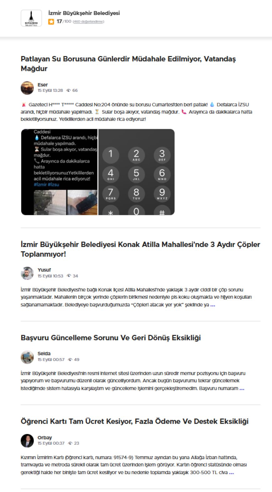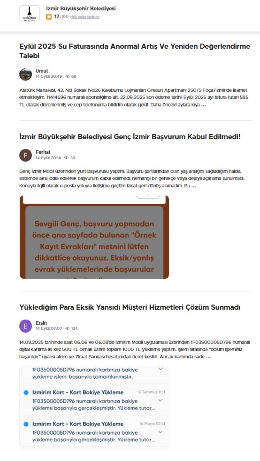 Habere referans olarak Şikayetvar sitesinde yer alan şikâyetlere göre; son günlerde İzmir’de belediye ve bağlı şirket/kurum hizmetlerine ilişkin çok sayıda bildirim paylaşılıyor. Başvuruların önemli kısmı İZSU’nun arıza müdahaleleri, çöp toplama ve ulaşım–ödeme sistemleri etrafında toplanıyor. Kullanıcılar, başvurularına zamanında geri dönüş alamadıklarını, bazı birimlerin saha uygulamalarında güvenlik ve hijyen riskleri oluştuğunu iddia ediyor. Belediye kanadından haber yayına hazırlanırken resmî bir açıklama gelmezken, yetkililerin dosyaları incelediği belirtiliyor.