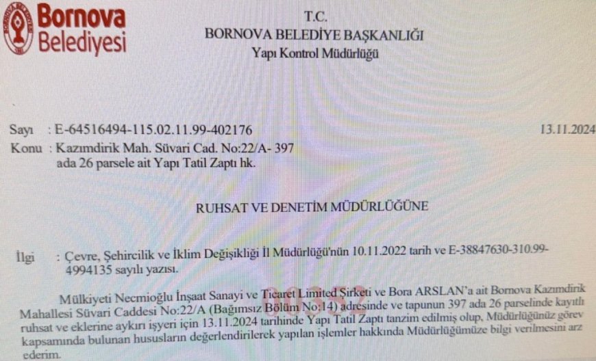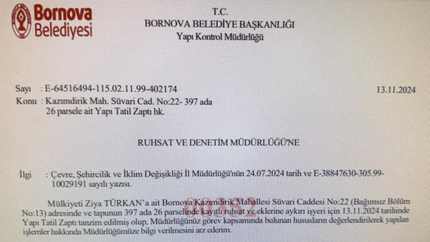 İzmir’in gözde ilçelerinden Bornova’da büyük bir skandal patlak verdi. Bornova Belediye Başkan Yardımcısı Barbaros Taşer’in, mülkiyeti başkalarına ait olan 2 bar ve 1 kafenin, yapı kayıt belgelerinin Çevre, Şehircilik ve İklim Değişikliği Bakanlığı tarafından iptal edilmesine rağmen faaliyetlerine devam ettiği ortaya çıktı. Ancak bu işletmelerin mühürlenmesi ve ruhsatlarının iptal edilerek faaliyetten men edilmesi gerekirken, Bornova Belediye Başkanı Ömer Eşki'nin İl Müdürlüğü'nden gelen yazılara rağmen hiçbir işlem yaptırmaması dikkat çekti.