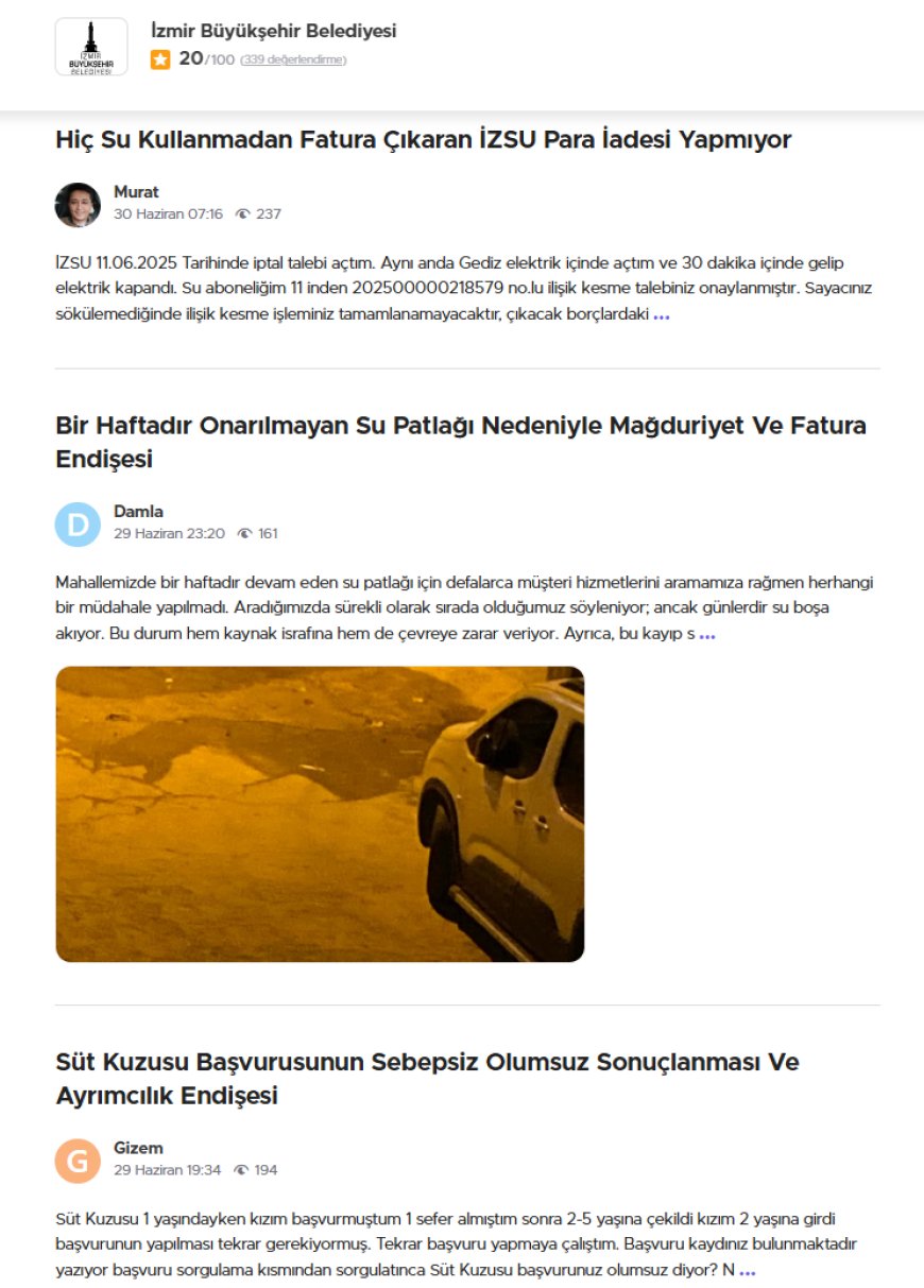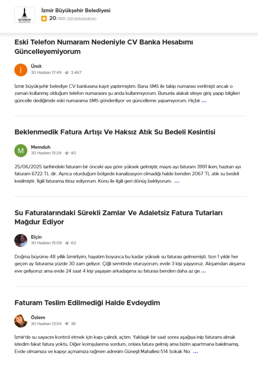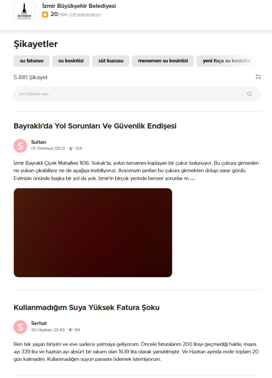 İzmir Büyükşehir Belediyesi’ne yönelik son dönemde artan şikayetler, kentte su faturalarından altyapı sorunlarına kadar geniş bir yelpazeyi kapsıyor. Belediye hakkında yayınlanan 5.881’den fazla şikayetin büyük kısmı, beklenmedik fatura artışları, uzun süren su kesintileri ve yol bakım eksiklikleri gibi temel belediye hizmetlerinde yaşanan aksamalarla ilgili.