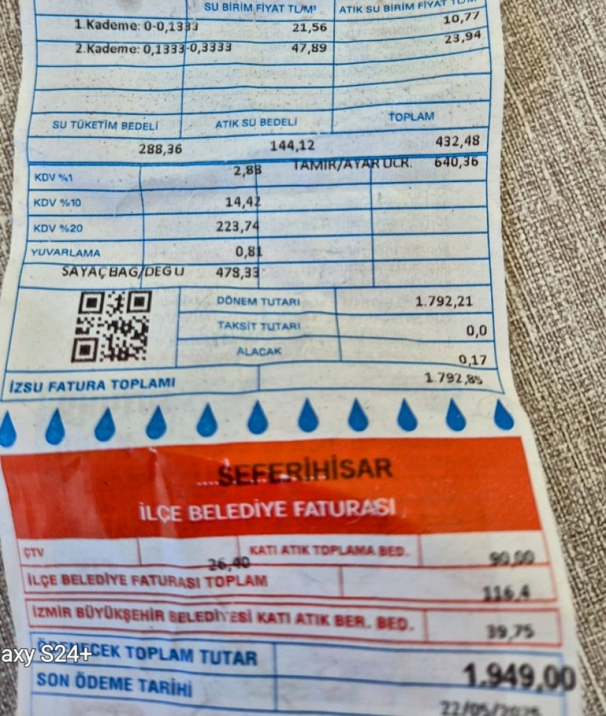 İzmir’in Seferihisar ilçesinde yaşayan vatandaşların İZSU tarafından gönderilen Mayıs 2025 tarihli su faturaları, kamuoyunda büyük tepkiye neden oldu. Su tüketimi 432,82 TL olan bir fatura; sayaç tamir, ayar, değiştirme bedelleri ve çeşitli belediye kalemleriyle birlikte 2.134 TL’ye ulaştı. “Bu nasıl sosyal belediyecilik?” sorusu vatandaşların en çok yönelttiği tepki haline geldi.