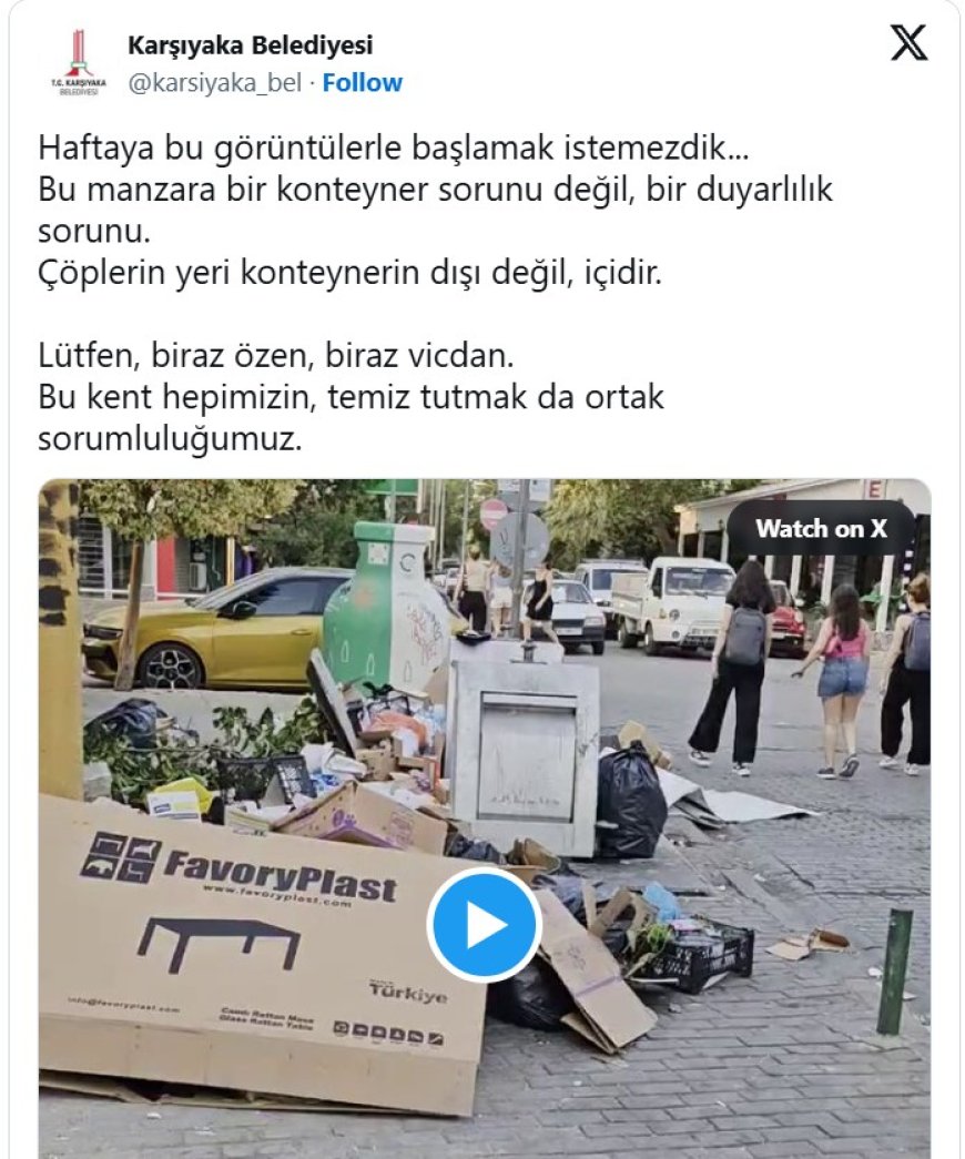 İzmir’in Karşıyaka ilçesinde uzun süredir gündemden düşmeyen çöp sorunu, Karşıyaka Belediyesi’nin sosyal medya hesabından yaptığı paylaşım sonrası yeni bir boyut kazandı. CHP’li belediye, sosyal medya platformu X (eski adıyla Twitter) üzerinden yayımladığı mesajda, konteynerlerin dışında biriken büyük miktardaki çöplerin sorumlusunun halk olduğunu ima ederek, “Bu manzara bir konteyner sorunu değil, bir duyarlılık sorunu” ifadelerini kullandı. Belediye ayrıca, çöp dağlarını gösteren görüntüler eşliğinde vatandaşlara “biraz vicdan” çağrısı yaptı.