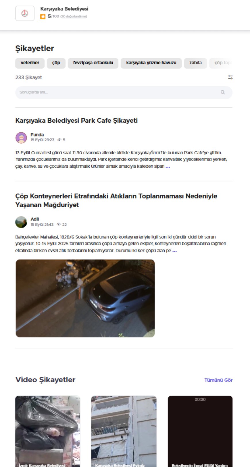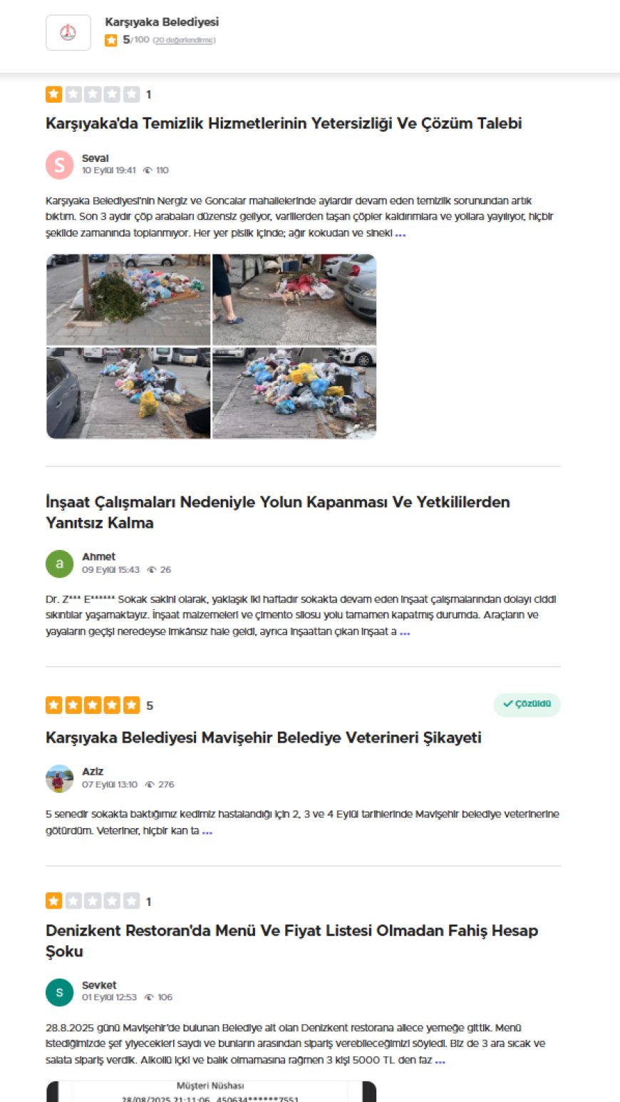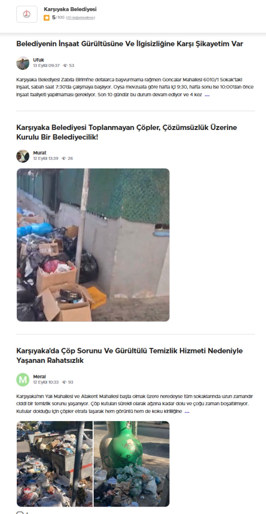 Habere referans olarak Şikayetvar sitesinde yer alan şikâyetlere göre; Karşıyaka Belediyesi’ne son günlerde temizlik hizmetleri, gürültü denetimi, park–kafe işletmeleri ve bazı belediye tesisleri hakkında çok sayıda başvuru iletiliyor. Kullanıcılar özellikle çöp konteynerlerinin etrafında biriken atıklar, sabaha karşı başlayan inşaat gürültüleri, kafe/restoranlarda fiyat ve menü şeffaflığı, ayrıca veteriner hizmetlerine erişim gibi başlıklarda sorun bildirdi. Belediye kanadından haber yayına hazırlanırken resmî bir açıklama gelmedi.