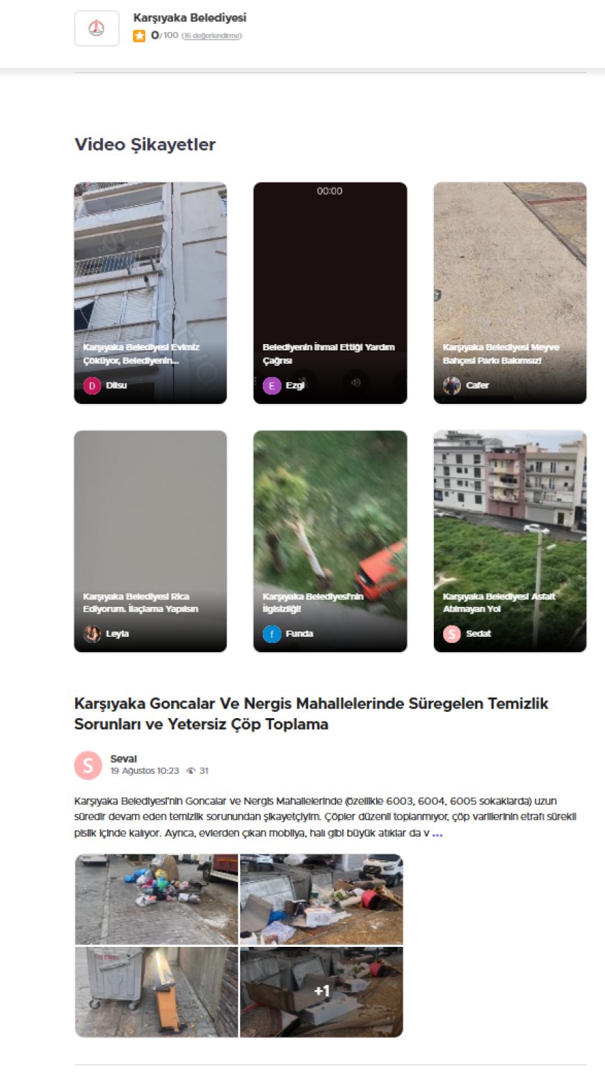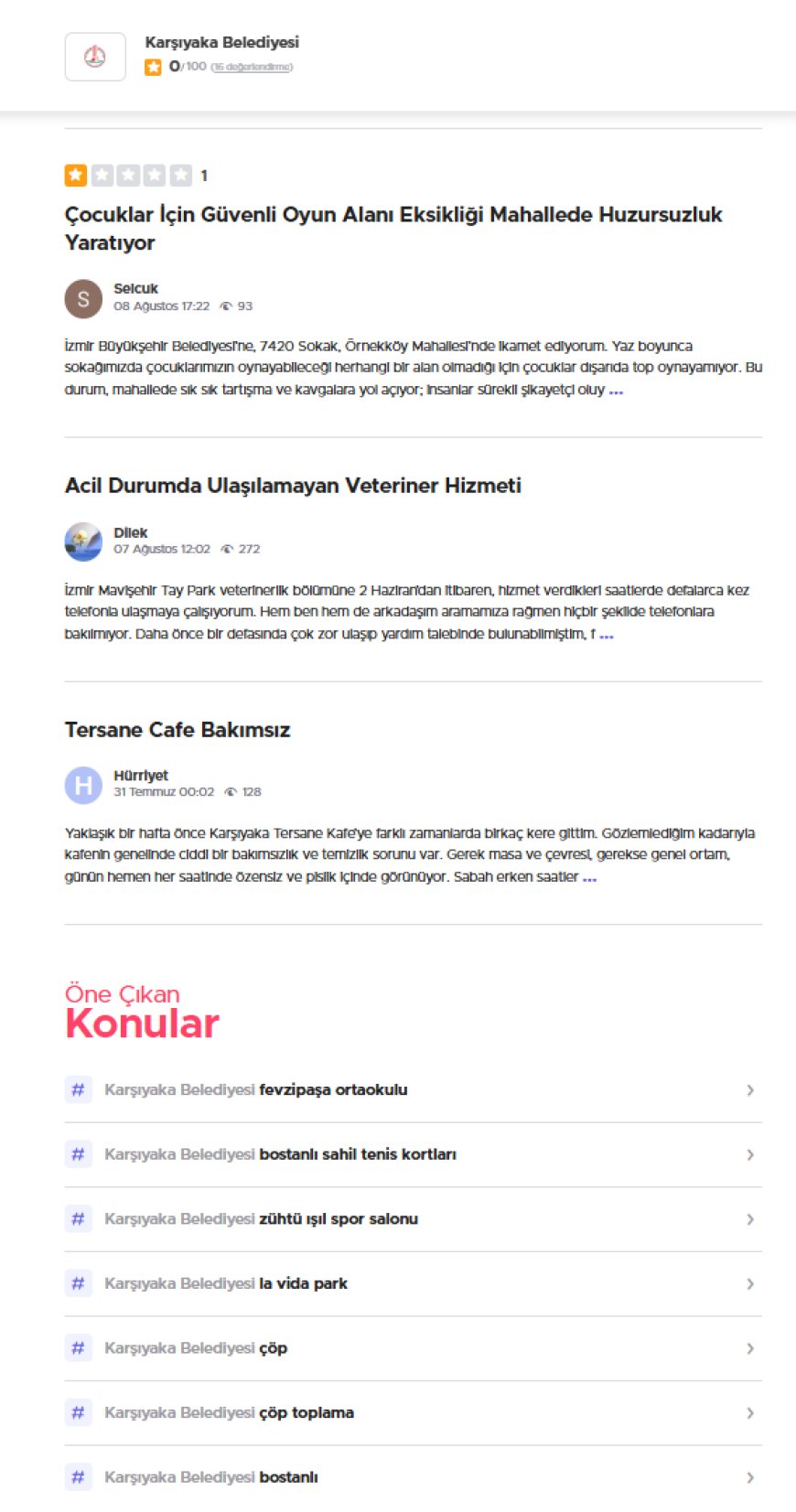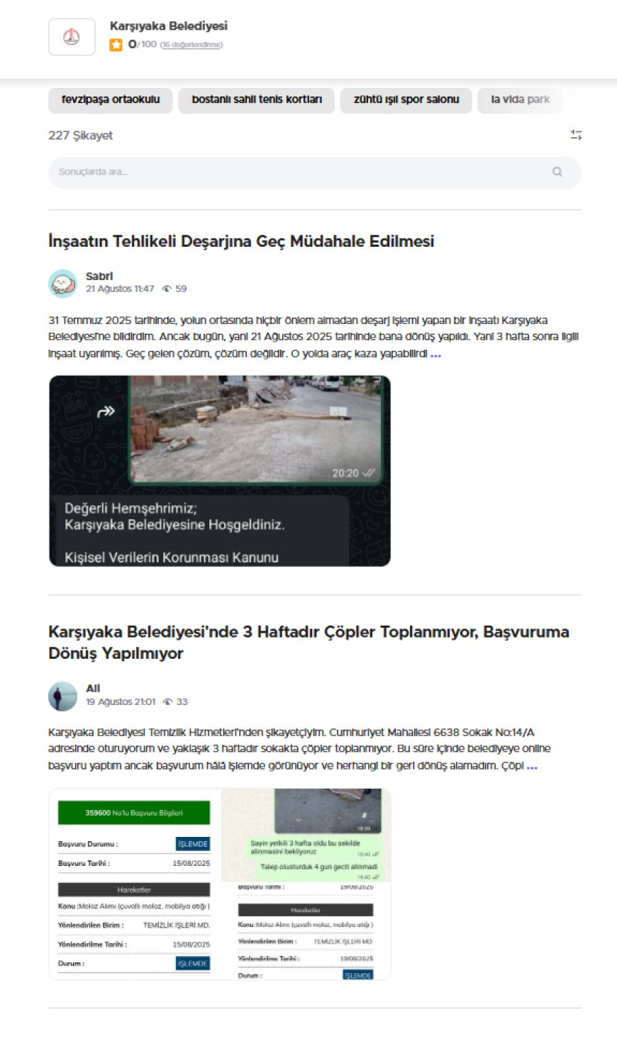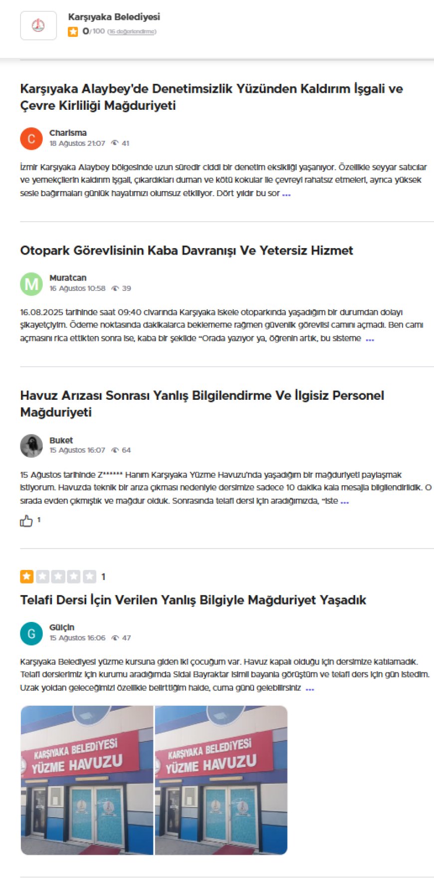 Şikayetvar sitesinde yer alan şikayetlere göre; Karşıyaka Belediyesi’ne ilişkin bildirimler yaz aylarında temizlik–çevre, denetim–zabıta, tesis/tesisat yönetimi ve vatandaş iletişimi başlıklarında yoğunlaşıyor. Platformda kurum için 0/100 memnuniyet puanı, 16 değerlendirme ve 227 şikâyet görünüyor. Son iki hafta içinde gelen başvurular, hem operasyonel aksaklıkların hem de şeffaf bilgilendirme eksikliğinin öne çıktığını ortaya koyuyor.