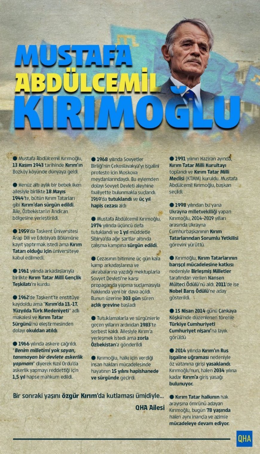 Bugün 80 yaşını dolduran Mustafa Abdülcemil Kırımoğlu, işgalci Rusya’nın Ukrayna’ya karşı başlattığı topyekun savaş şartları altında Kırım Tatar halkına önderlik etmeyi ve mücadelesini büyük bir sabır ve fedakârlıkla sürdürmeye devam ediyor.