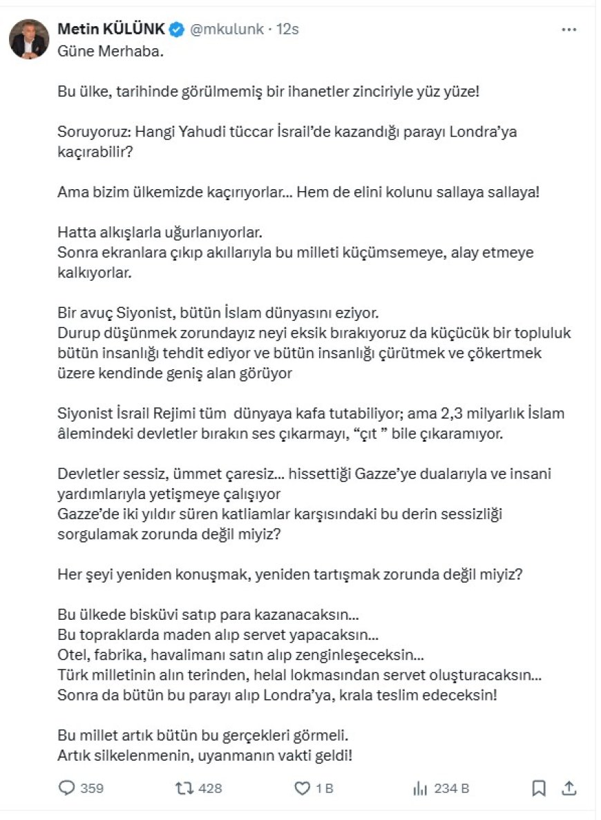 AK Partili siyasetçi ve eski milletvekili Metin Külünk, sosyal medya hesabından yaptığı paylaşımla ekonomik ve jeopolitik başlıklarda sert eleştiriler yöneltti. Mesajında Türkiye’nin “tarihinde görülmemiş bir ihanetler zinciriyle” yüz yüze olduğunu savunan Külünk, bazı sermaye gruplarının kazançlarını yurtdışına taşıdığını ileri sürerek toplumun “silkinmesi ve uyanması” çağrısında bulundu. Paylaşım, tonu ve kullandığı benzetmeler nedeniyle kısa sürede gündem oldu.