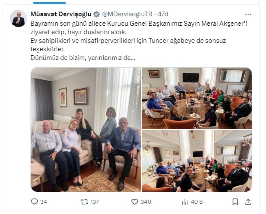 Dervişoğlu, bayram ziyaretine ilişkin sosyal medya hesabından paylaşım yaparak "Bayramın son günü ailece Kurucu Genel Başkanımız Sayın Meral Akşener’i ziyaret edip, hayır dualarını aldık. Ev sahiplikleri ve misafirperverlikleri için Tuncer Ağabey'e de sonsuz teşekkürler." dedi.