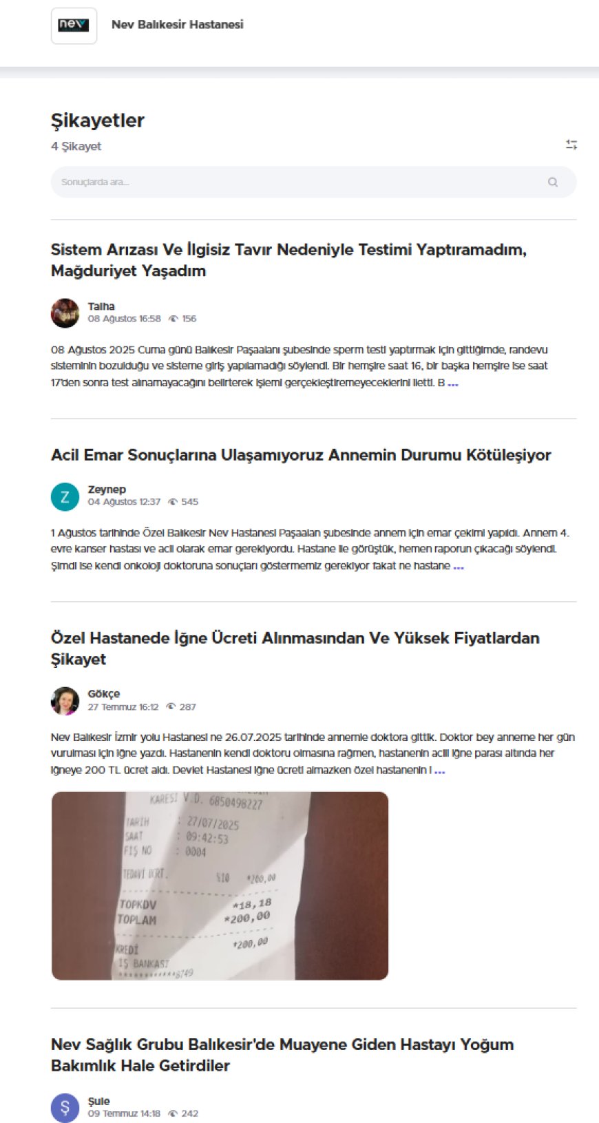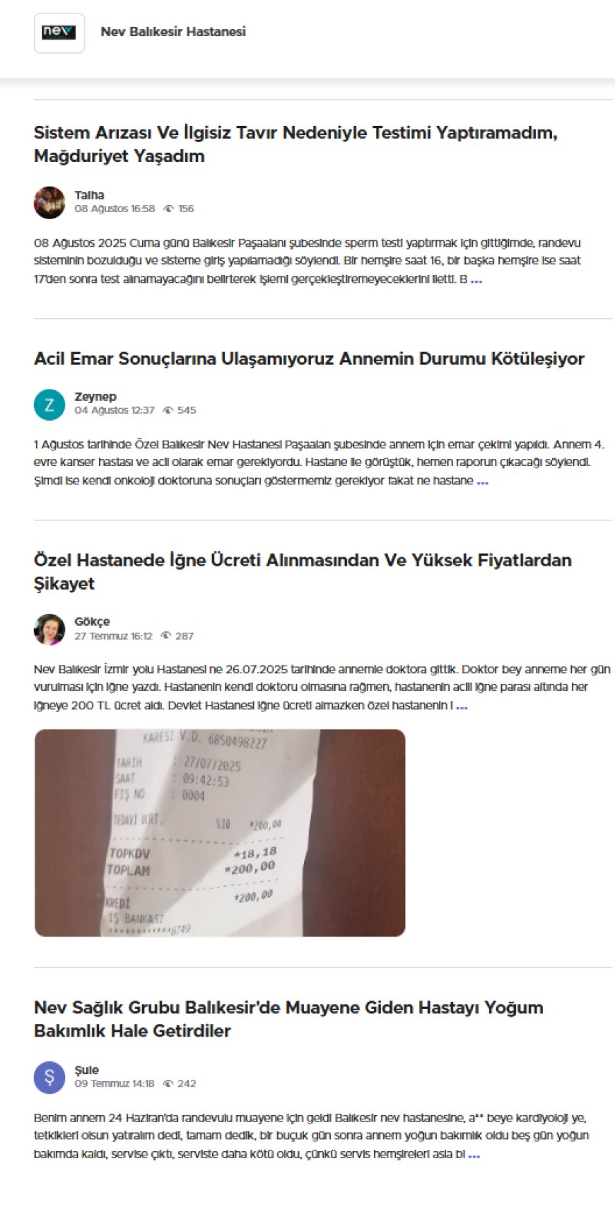 Balıkesir’de faaliyet gösteren Nev Balıkesir Hastanesi, son dönemde birçok hasta ve hasta yakınının olumsuz deneyimleriyle gündeme geldi. Şikayetvar platformunda yer alan şikayetlere göre; hastanede sistem arızaları, ilgisiz yaklaşımlar, yüksek ücretler ve tedavi süreçlerindeki yetersizlikler, vatandaşlarda güven sorununa yol açıyor.