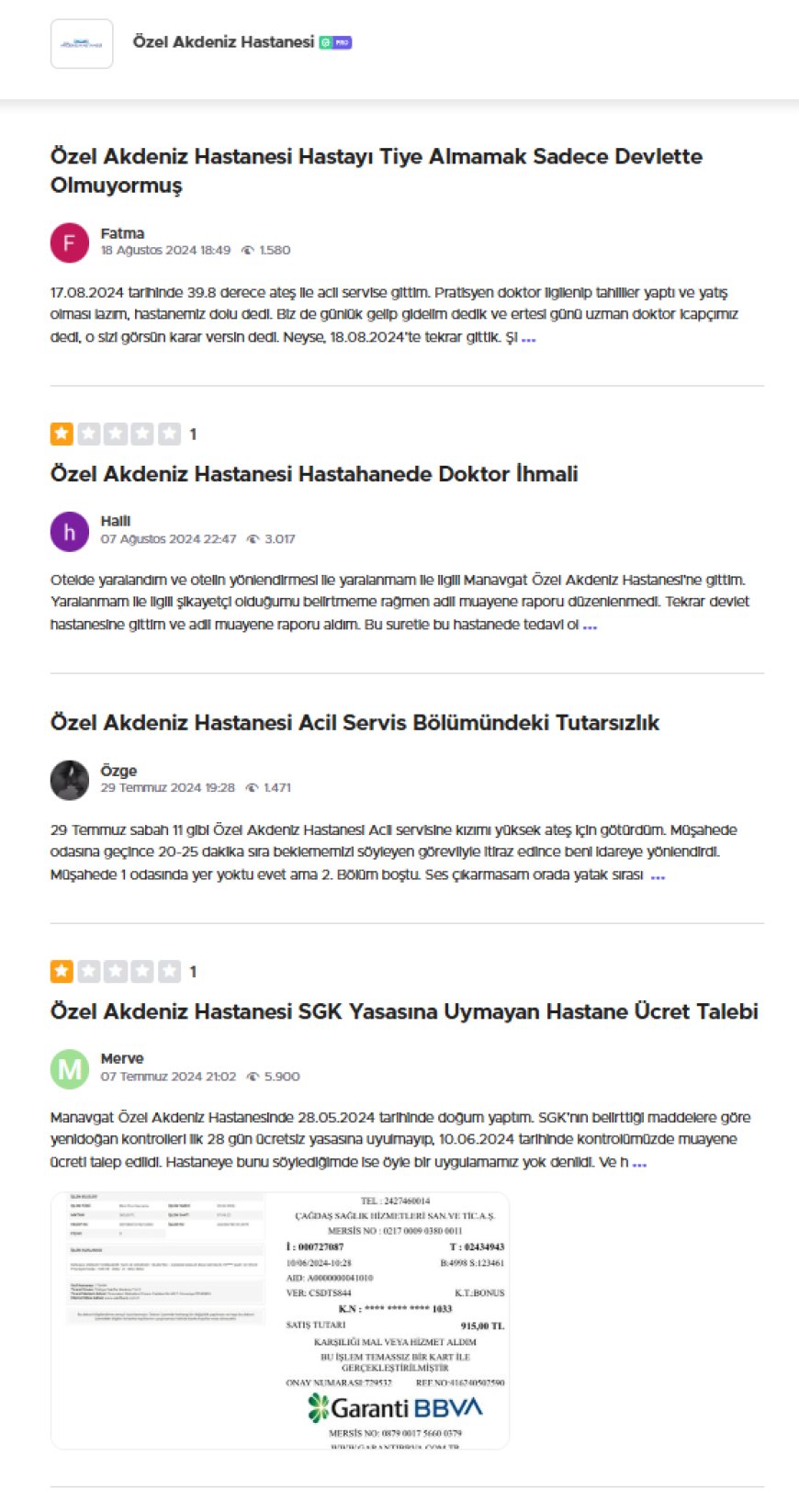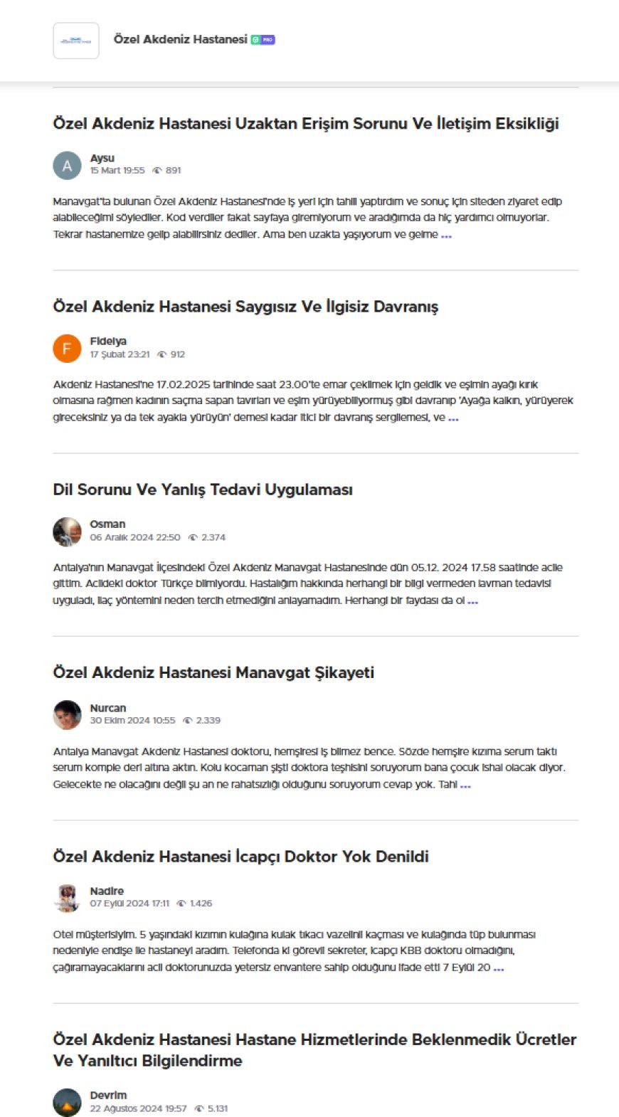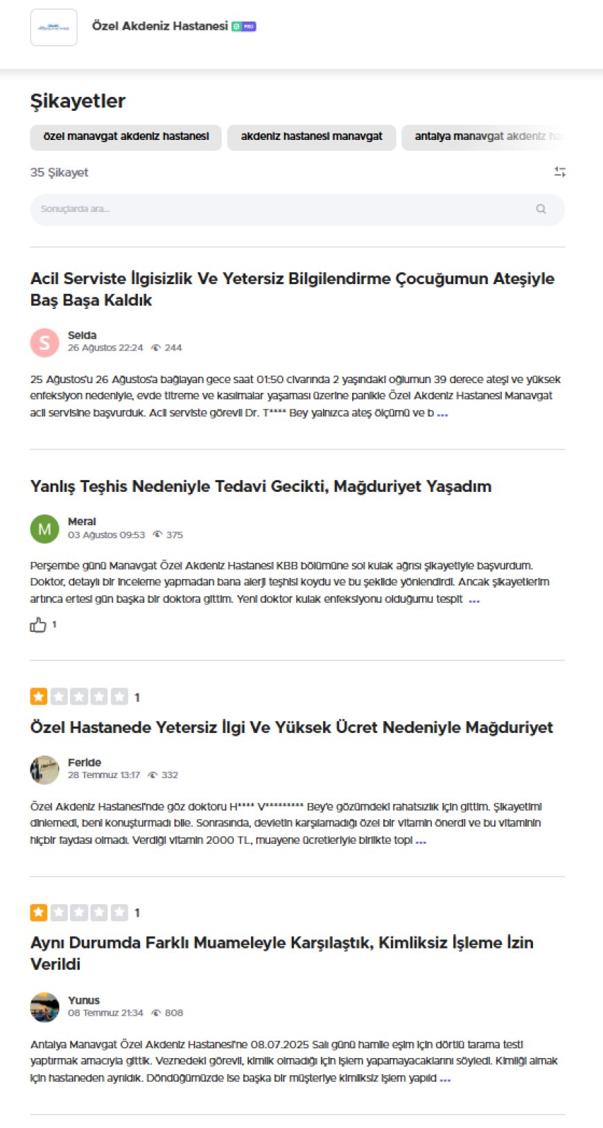 Habere referans olarak Şikayetvar sitesinde yer alan şikâyetlere göre; Manavgat’taki Özel Akdeniz Hastanesi hakkında son dönemde paylaşılan kullanıcı anlatımları özellikle acil servis uygulamaları, teşhis–tedavi süreçleri, kimlik/doğrulama prosedürleri ve dijital sonuç erişimi başlıklarında yoğunlaşıyor. Aşağıdaki bölümlerde aktarılanlar hasta beyanlarına dayalı iddialardır; tıbbi ve idarî teyit, hastanenin resmî açıklamalarıyla netleşecektir. (Kurumun Şikayetvar’da “pro üyelik avantajlarını kullandığı” da platformda belirtiliyor.)