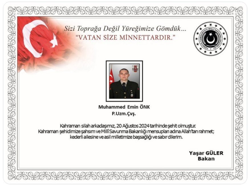 Türkiye, bir kahraman Mehmetçiğini daha kaybetti. Pençe-Kilit operasyonu bölgesinde 3 Ağustos 2024 tarihinde el yapımı patlayıcının infilak etmesi sonucu ağır yaralanan Piyade Uzman Çavuş Muhammed Emin Önk, tedavi gördüğü Gülhane Eğitim ve Araştırma Hastanesi'nde şehit oldu.