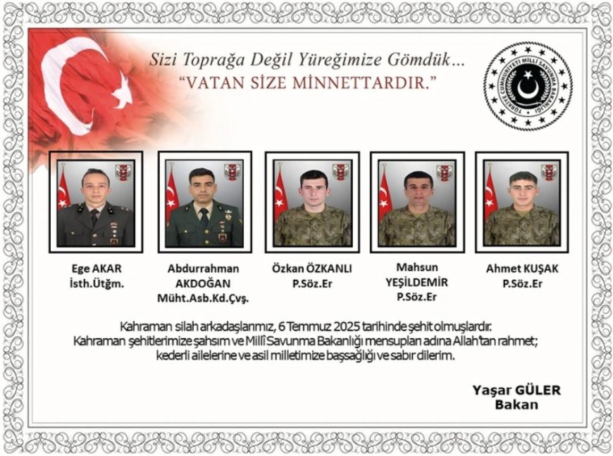 Milli Savunma Bakanlığı tarafından paylaşılan bilgilere göre şehit olan kahramanların isimleri şöyle: