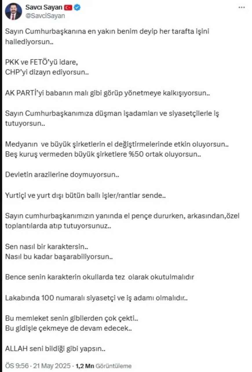 Sayan, X (eski Twitter) hesabından yaptığı paylaşımda, bu kişinin hem AK Parti’yi içeriden yönlendirmeye çalıştığını hem de muhalefet partileriyle perde arkasında ilişki kurduğunu öne sürdü. Yazdığı ifadeler, yalnızca parti tabanında değil, siyasi kulislerde de yankı buldu.