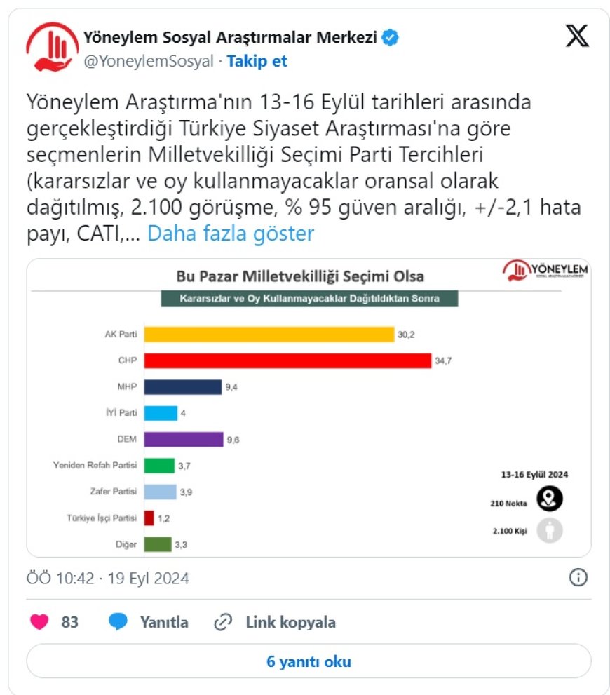 Yöneylem Araştırma’nın son anket sonuçları, siyasi arenada dikkat çeken bir tablo ortaya koydu. 13-16 Eylül tarihleri arasında 2.100 kişi ile gerçekleştirilen ankette, katılımcılara "Bu pazar milletvekilliği seçimi olsa oyunuzu hangi partiye verirsiniz?" sorusu yöneltildi. Ankette, kararsızlar ve oy kullanmayacaklar dağıtıldıktan sonra CHP’nin yüzde 34.7 oy oranı ile ilk sırada yer aldığı görüldü.