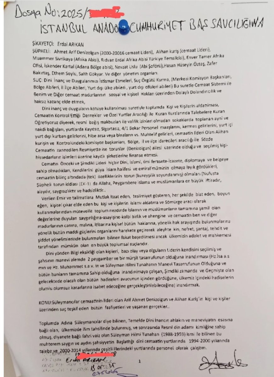 Süleymancılar cemaatinde 2000-2014 yılları arasında yöneticilik ve hocalık yapan Erdal Arıkan, cemaatin mevcut lideri Alihan Kuriş hakkında İstanbul Anadolu Cumhuriyet Başsavcılığı’na suç duyurusunda bulundu. Arıkan, dilekçesinde cemaatin devlet içinde nasıl örgütlendiğini, kayıt dışı mali işlemleri ve dini istismarı belgeleriyle birlikte savcılığa sundu.
