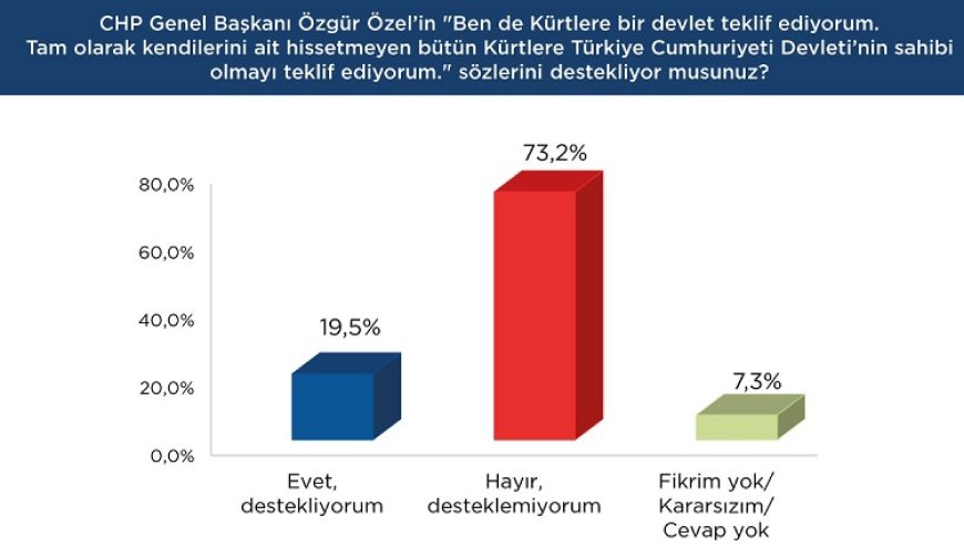 Cumhuriyet Halk Partisi de benzer bir oy kaybıyla karşı karşıya. Eylül ayında yüzde 32,7 ile birinci parti konumunda olan CHP, bu ayki ankette kararsızlar dağıtıldığında yüzde 26,9’a geriledi. Bu, CHP’nin geçen ayki seçmenlerinin yüzde 17,8’ini kaybettiği anlamına geliyor. Özgür Özel’in “Kürtlere vaadi” içeren açıklamaları, CHP seçmenleri arasında da destek bulmadı. Ankete katılanların yüzde 73,2’si bu açıklamalara karşı olduğunu ifade etti.
