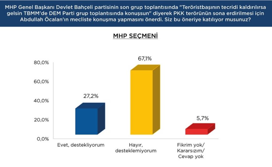 MHP, Devlet Bahçeli'nin "açılım" sürecine yönelik açıklamalarının ardından seçmen desteğinde önemli bir düşüş yaşadı. Anket sonuçlarına göre, MHP'nin oyu kararsızlar dağıtıldığında yüzde 7,5’e geriledi. Geçtiğimiz ay yapılan ankette yüzde 11,7 oy oranına sahip olan MHP, 4,2 puanlık bir düşüşle seçmenlerinin üçte birinden fazlasını kaybetti. Özellikle Bahçeli’nin Abdullah Öcalan’ın mecliste konuşma yapması önerisi, kamuoyunda büyük tepki topladı. Ankete katılanların yüzde 73,5’i Bahçeli’nin bu çıkışına karşı olduğunu belirtti.