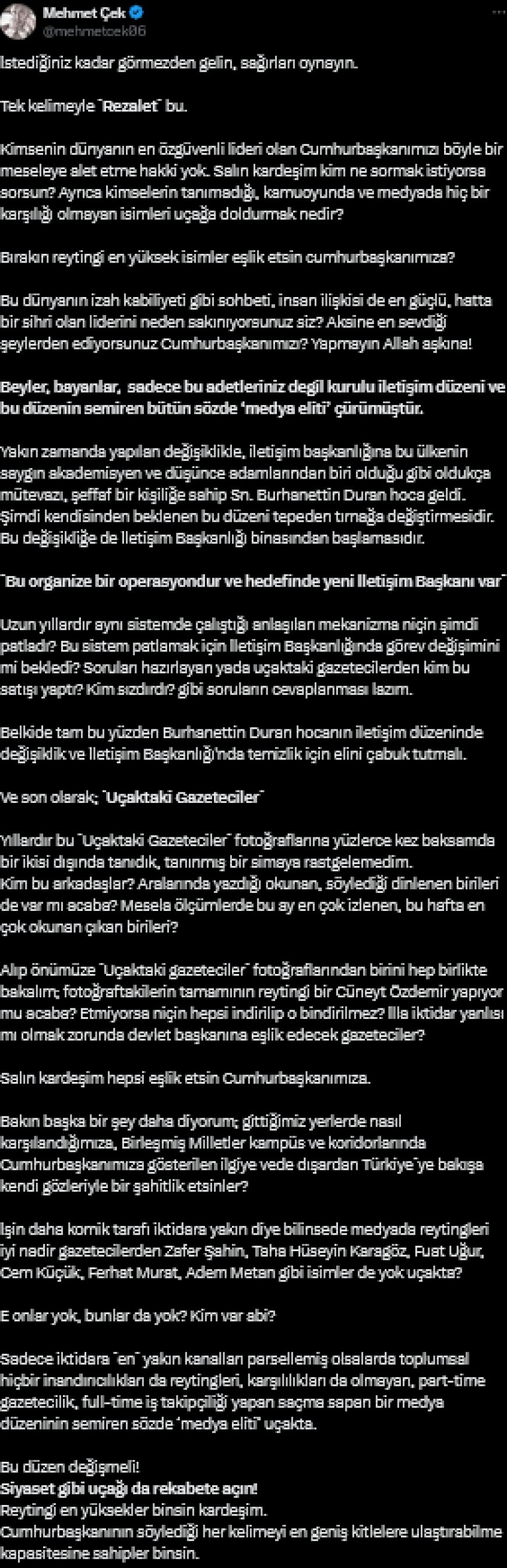 AKP’ye yakın gazeteci Mehmet Çek, “uçak röportajı” sorularının sızdığı iddiasını “rezalet” diye niteledi; hedefin İletişim Başkanı Burhanettin Duran olduğunu savundu, şeffaflık ve soru süreçlerinin yenilenmesini istedi.