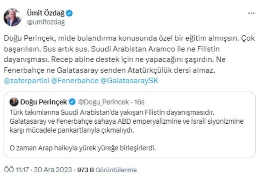Doğu Perinçek şimdi de Arapçı oldu. Galatasaray'ı ve Fenerbahçe'yi suçladı. Ümit Özdağ da Perinçek'i yerin dibine sokacak cevabı verdi