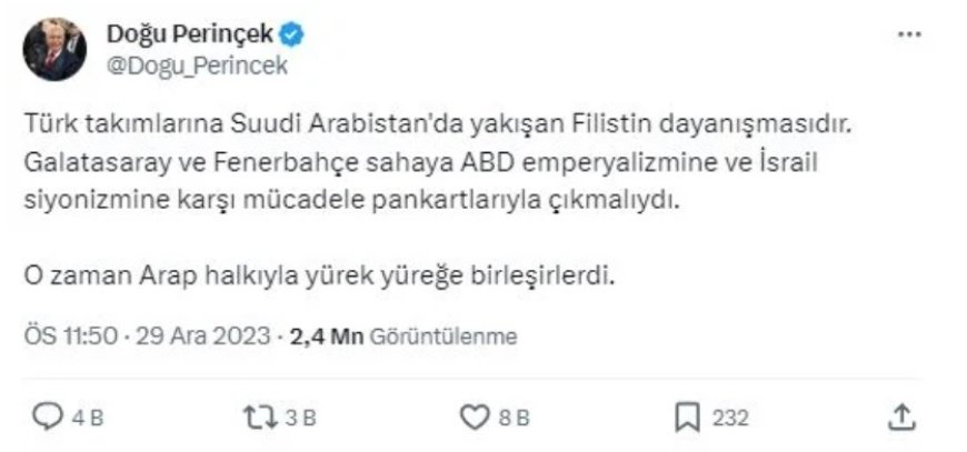 Perinçek sosyal medya hesabından "Türk takımlarına Suudi Arabistan'da yakışan Filistin dayanışmasıdır. Galatasaray ve Fenerbahçe sahaya ABD emperyalizmine ve İsrail siyonizmine karşı mücadele pankartlarıyla çıkmalıydı. O zaman Arap halkıyla yürek yüreğe birleşirlerdi." paylaşımını yaptı.